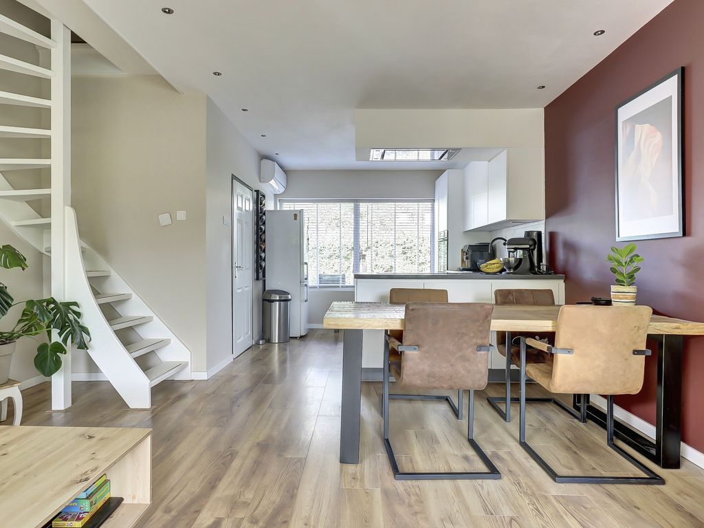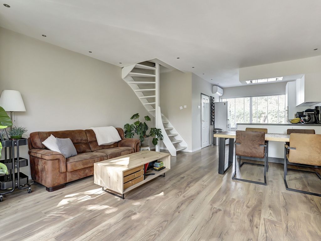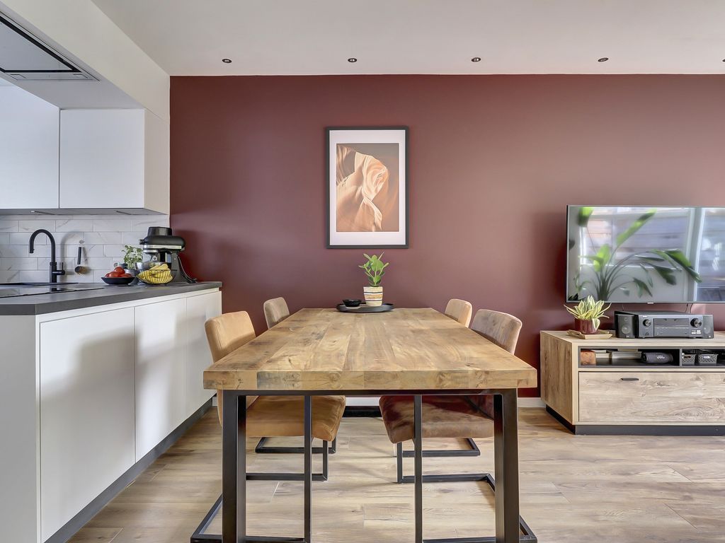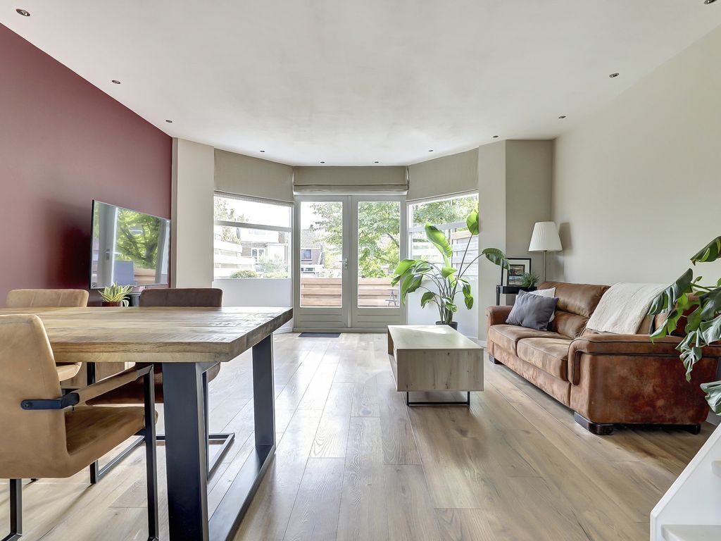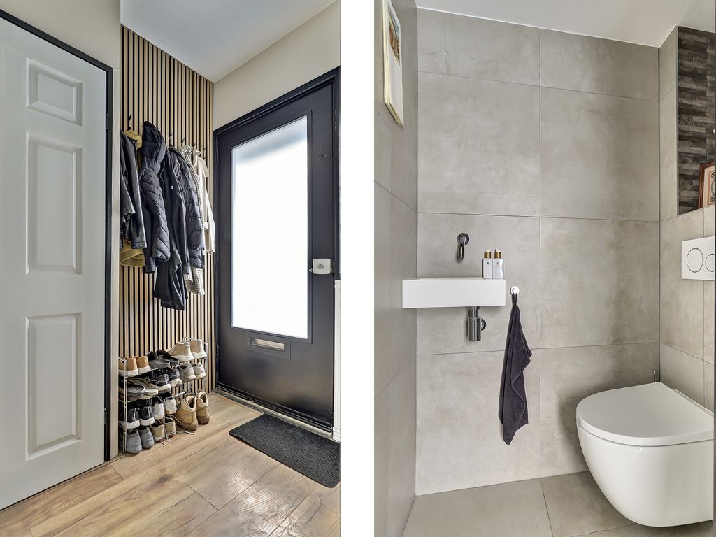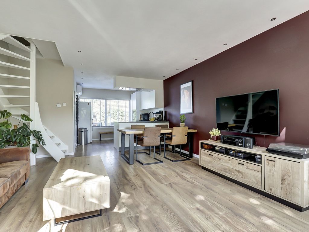 Via de hal met toilet, voorzien van hangcloset en fontein, stap je binnen in de lichte woonkamer met een warme eikenhouten vloer in brede planken en strak gestuukte wanden. De achtergevel is voorzien van een erker met triple glas en openslaande deuren naar het terras met uitzicht over de groene tuin. Het plafond in de woonkamer is strak afgewerkt met inbouwspots, wat zorgt voor een moderne, sfeervolle uitstraling.