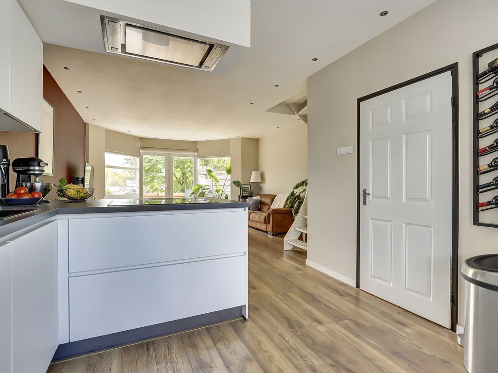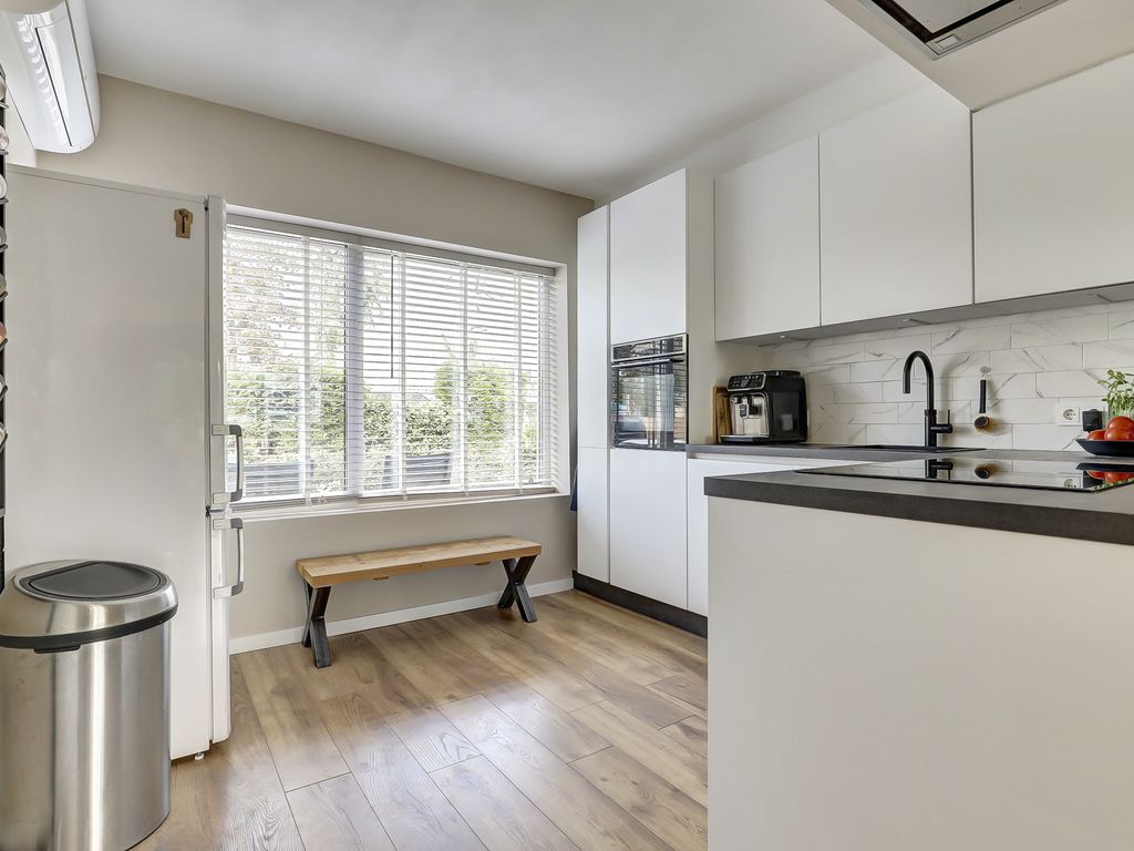 De keuken is in 2024 vernieuwd en modern en luxe uitgevoerd met greeploze witte fronten, een donker composiet werkblad en een marmerlook achterwand. De keuken is voorzien van hoogwaardige inbouwapparatuur, waaronder een inductiekookplaat, een afzuigkap met directe afvoer naar buiten, een combimagnetron, Quooker met grote boiler, vaatwasser en koel-vriescombinatie.