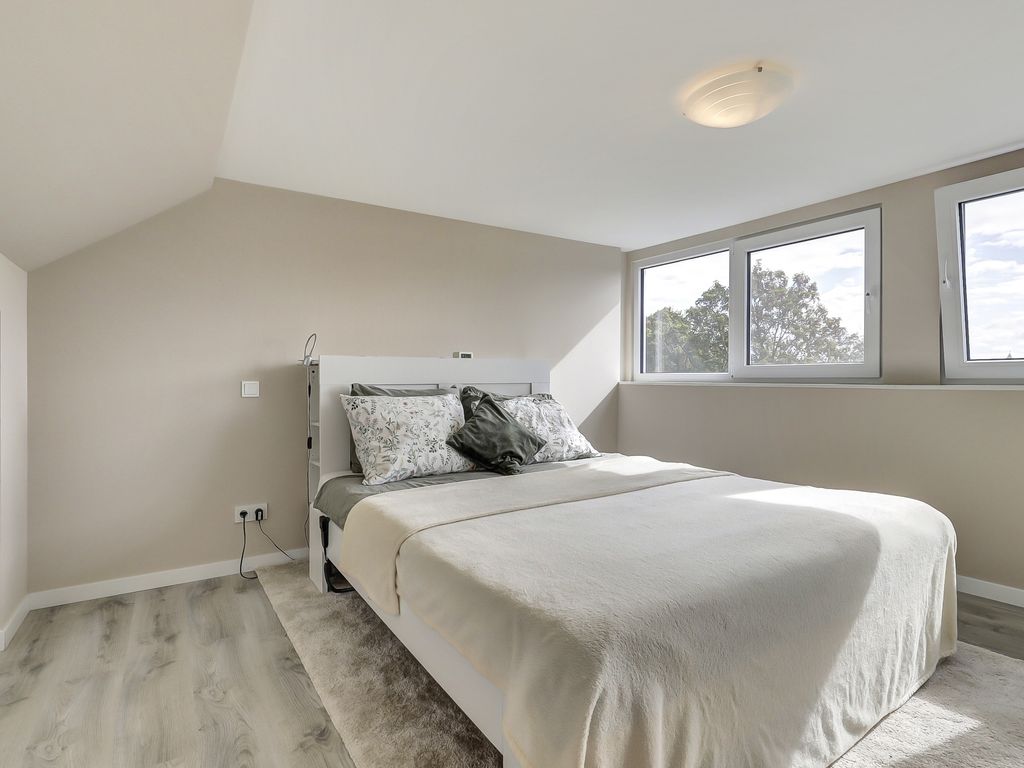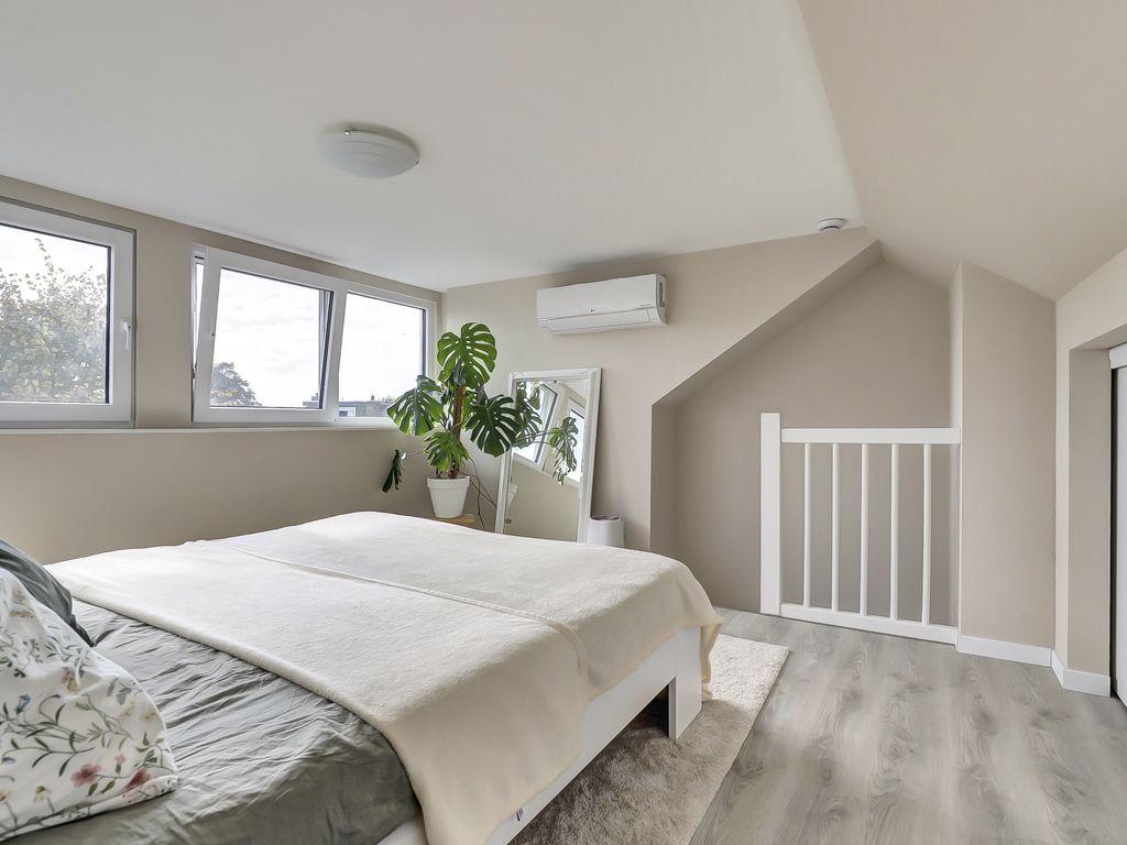 Via een vaste trap bereik je op de bovenste verdieping de derde royale slaapkamer met een dakkapel over de volle breedte waardoor er veel licht en extra ruimte is. Onder de schuine kap is extra bergruimte gecreëerd en bevindt zich hier in de vaste kastruimte de omvorm-installatie.