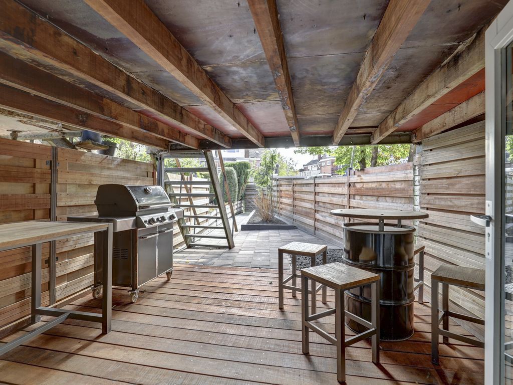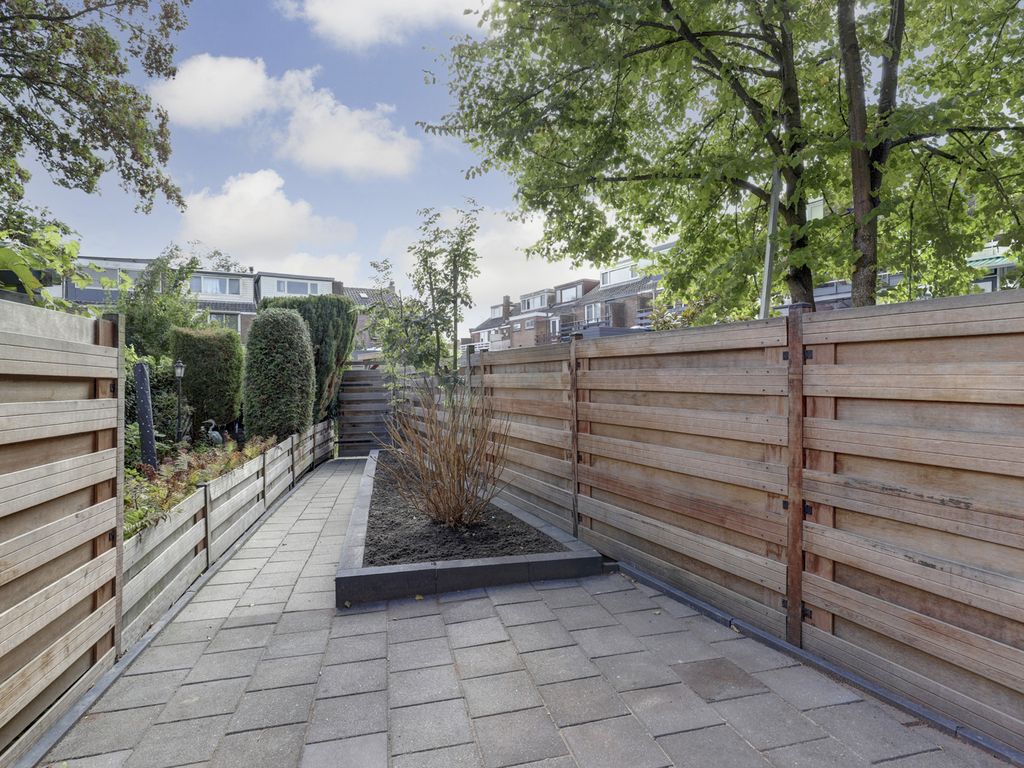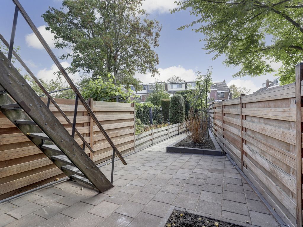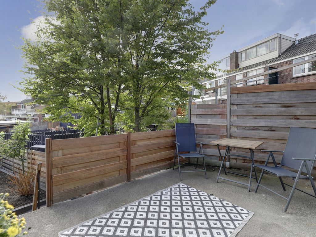 Vanuit de woonkamer stap je het dakterras op waar het heerlijk genieten is en middels een trap bereik je de diepe fraai aangelegd tuin met houten schuttingen voor optimale privacy en een ruim terras. Onder het balkon is een overdekt gedeelte gecreëerd met bergruimte: ideaal voor een gezellige zithoek of buitenkeuken.