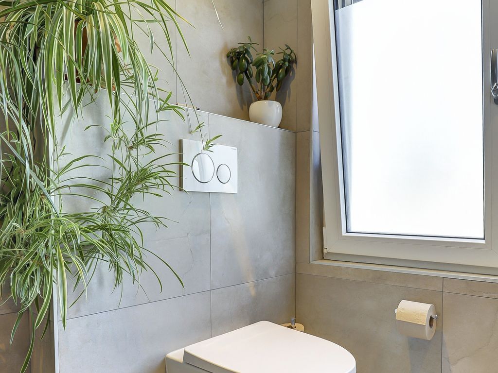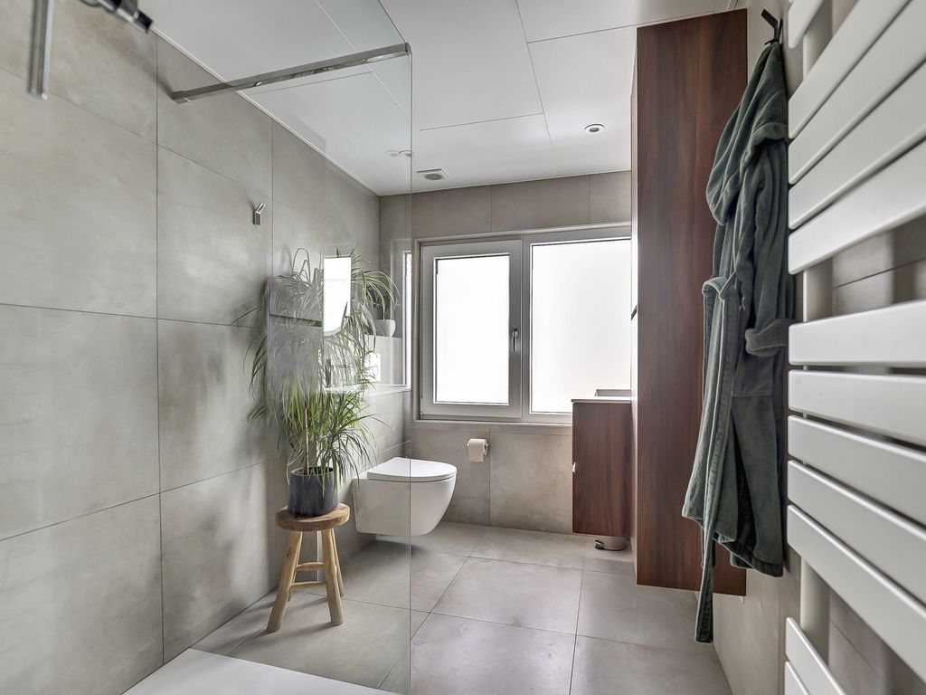 De moderne badkamer (vernieuwd in 2024) is geheel betegeld met grote grijsbeige tegels en voorzien van een inloopdouche met glazen wand, een hangcloset, een stijlvol houten wastafelmeubel, elektrische verwarming én comfortabele vloerverwarming. Het grote raam biedt daglicht en ventilatie, terwijl de strakke plafondspots zorgen voor een moderne afwerking.