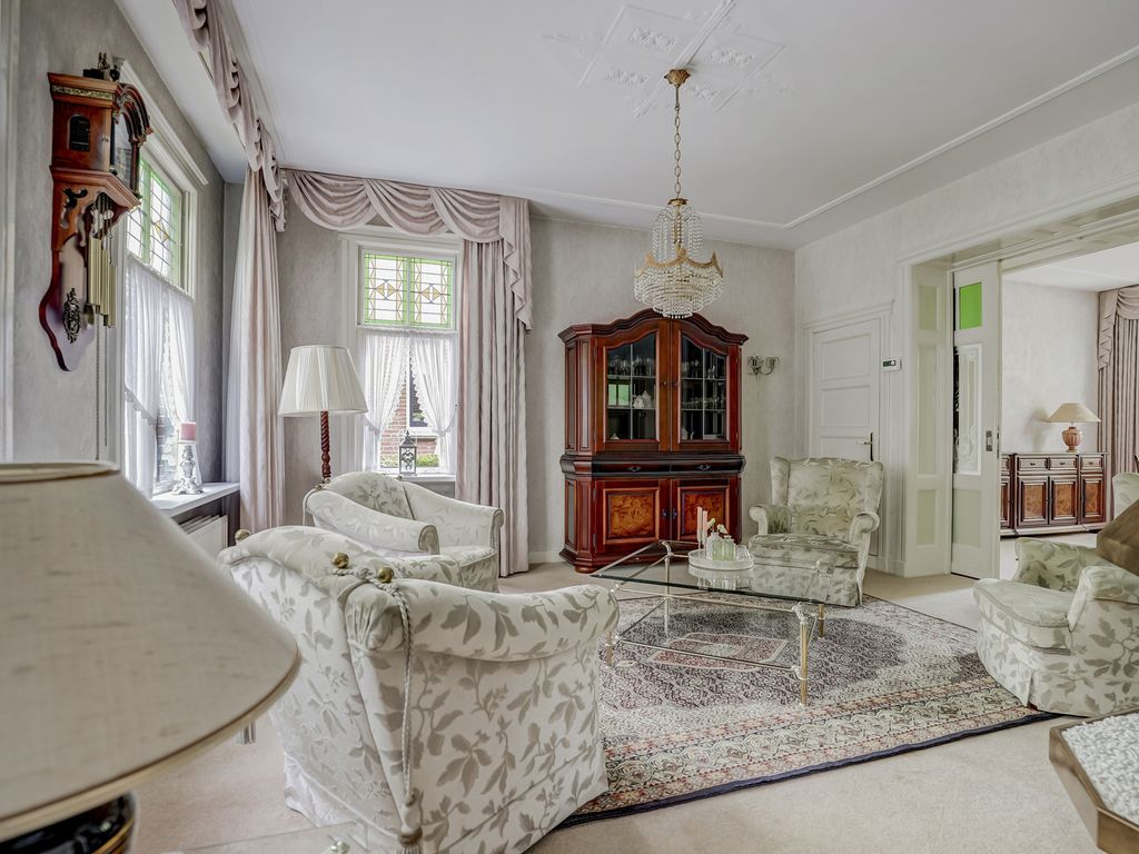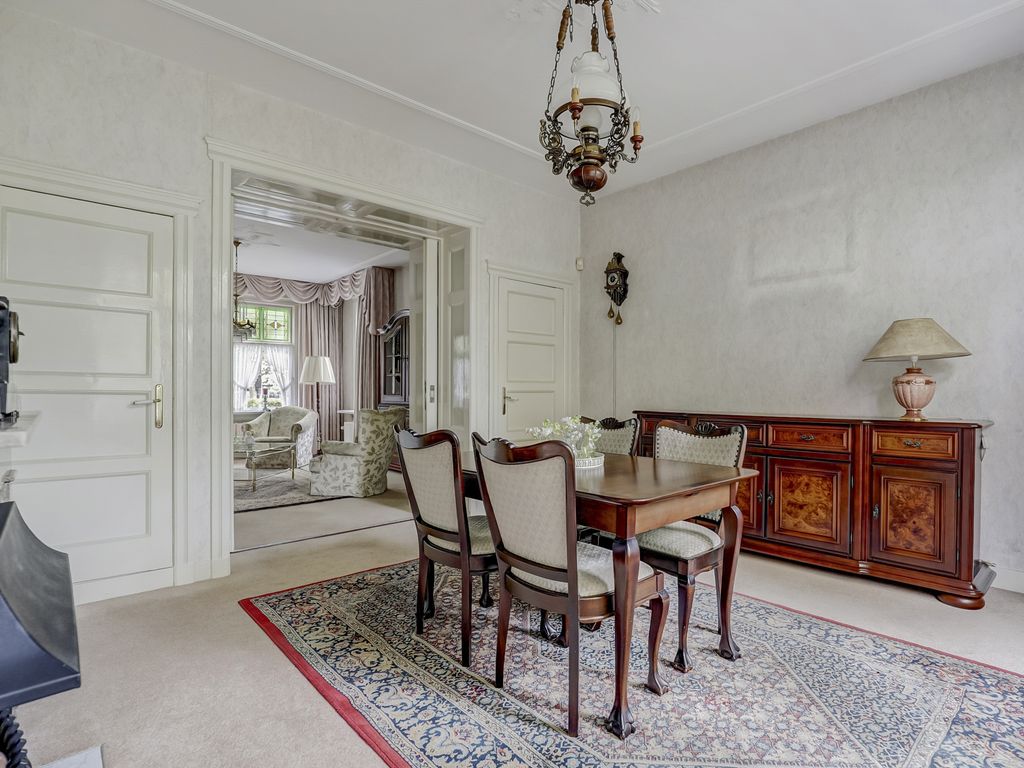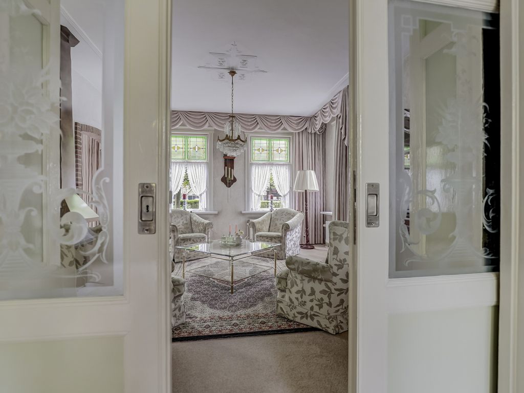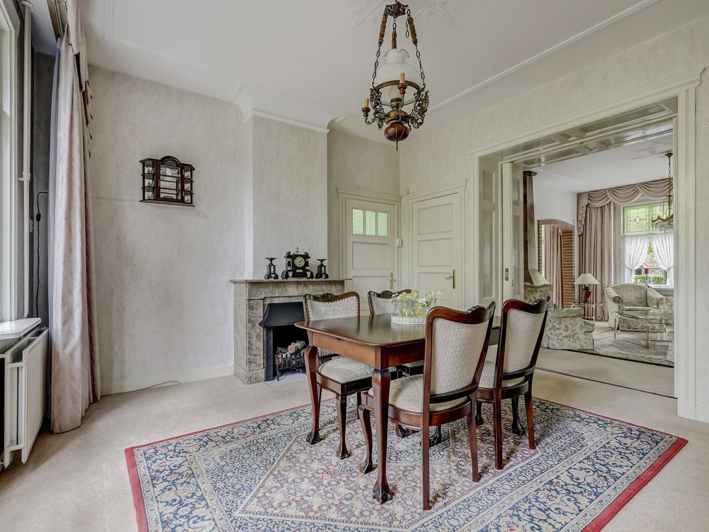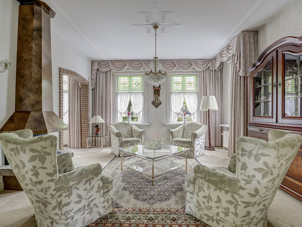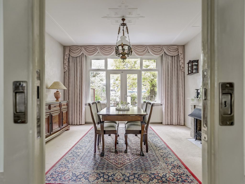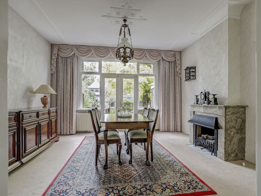 De woonkamer aan de voorzijde is sfeervol, met veel lichtinval, glas-in-loodramen en een open haard als blikvanger. Via ensuite deuren bereik je de achtergelegen eetkamer, die uitkijkt op de tuin en is voorzien van openslaande deuren en een marmeren schouw.