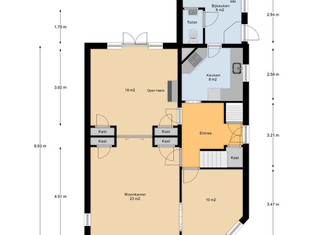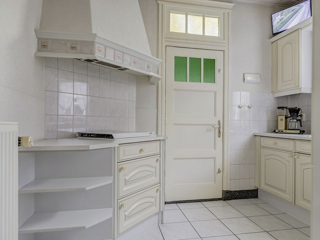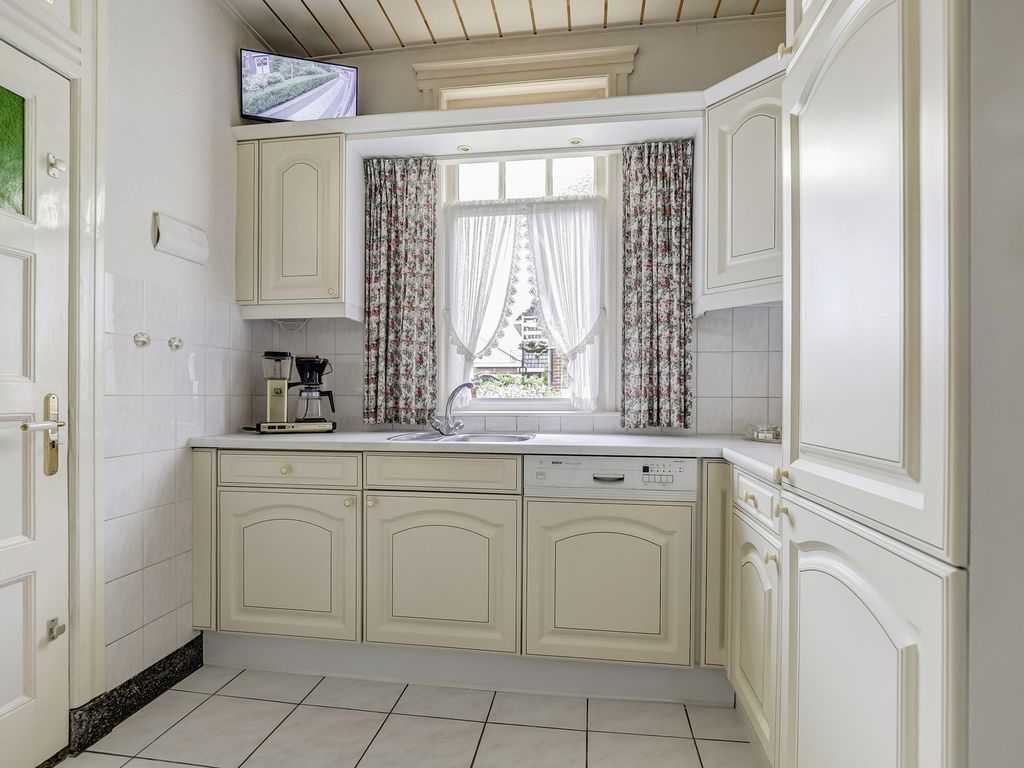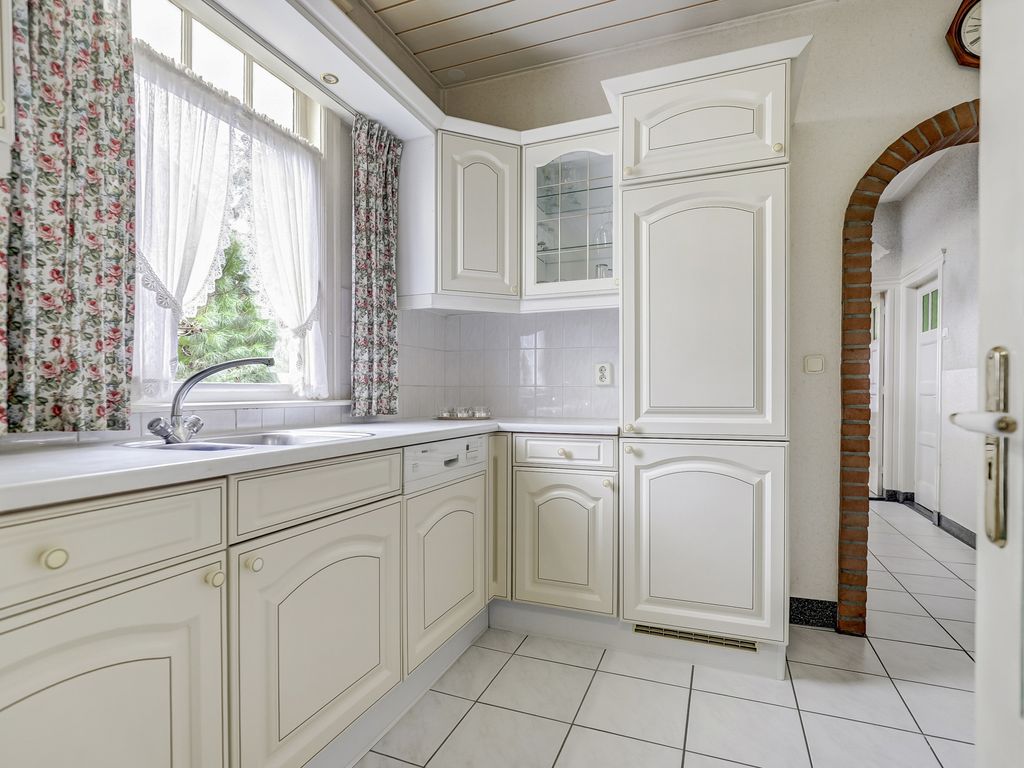 De keukenruimte is keurig en in lichte kleuren uitgevoerd, voorzien van een hoekopgestelde inrichting en apart kookgedeelte met afzuigschouw, voldoende vaste kasten en inbouwapparatuur. Aangrenzend bevindt zich een bijkeuken met plaats voor witgoed, c.v. installatie, een extra buitendeur en een separate toiletruimte.