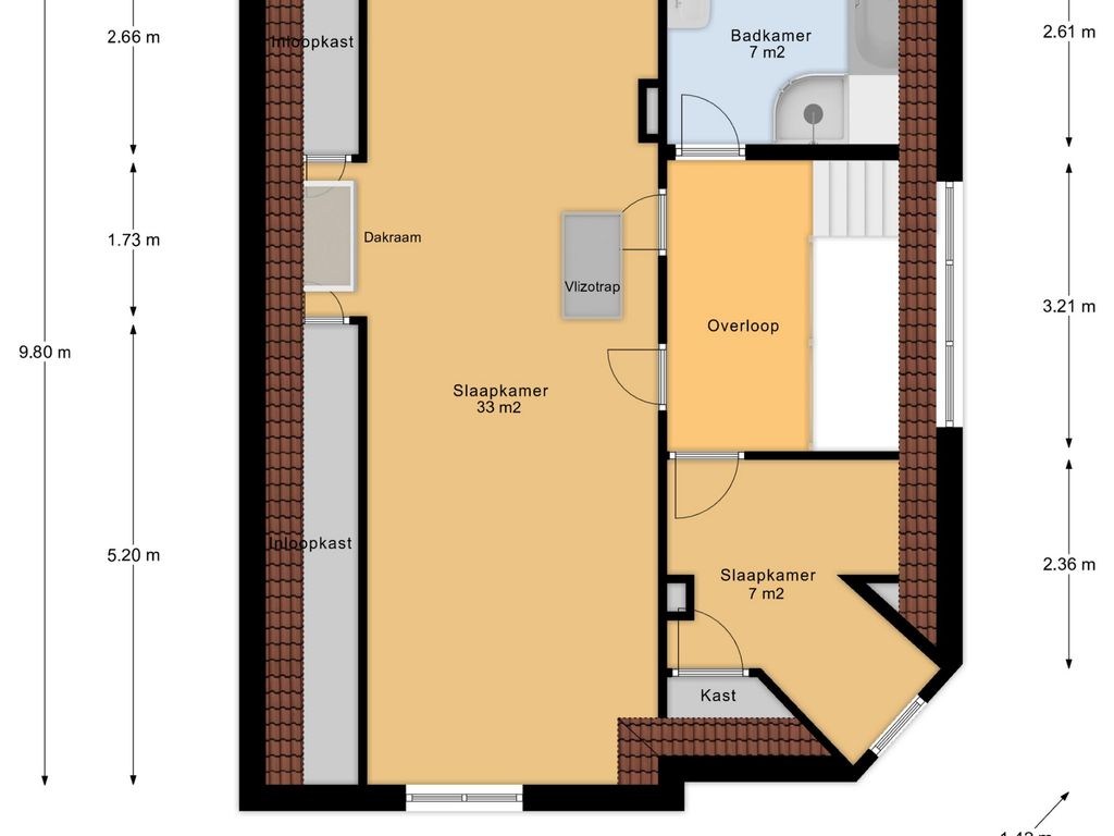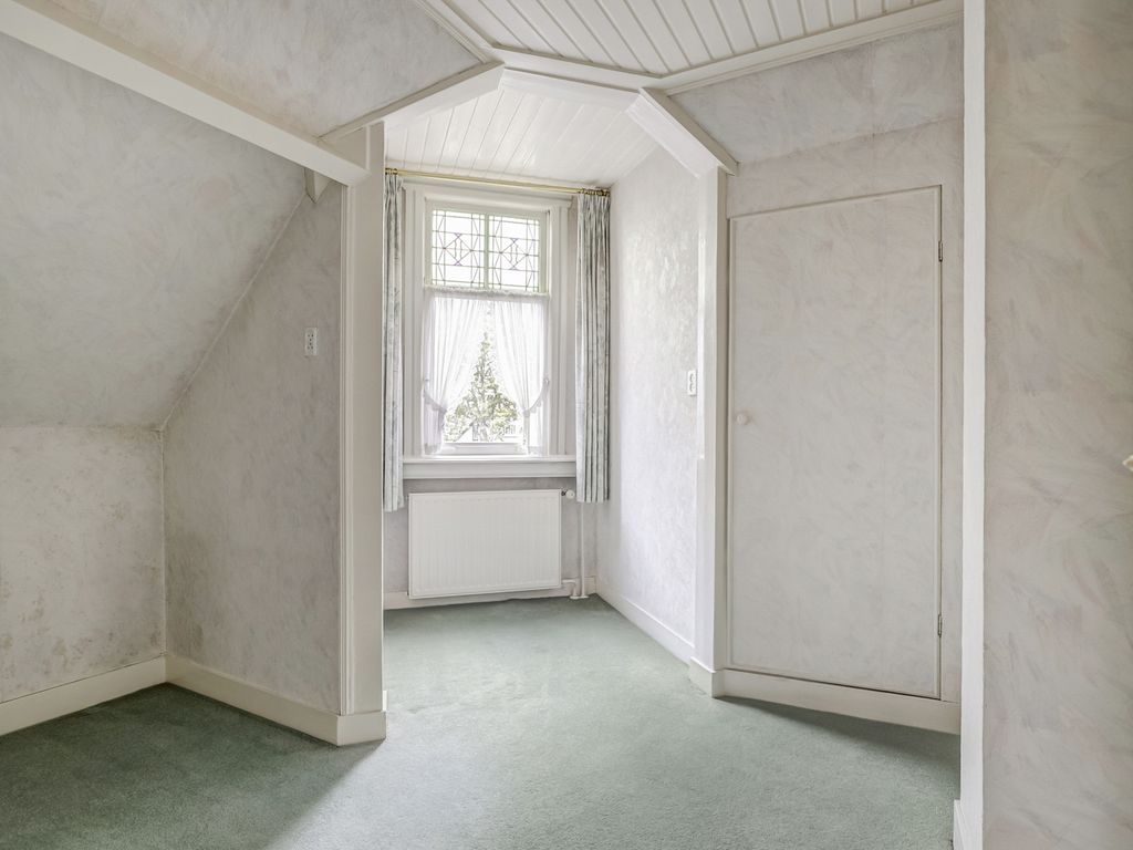 Via de fraaie klassieke trapopgang is de ruime overloop te bereiken. Hier tref je een indrukwekkende hoofdslaapkamer, ruim 33 m² groot, voorheen waren dit 2 ruime slaapkamers. De kamer is voorzien van een dakkapel, vaste kasten en veel daglicht. De tweede slaapkamer is compact en geschikt als logeerkamer of werkruimte. De badkamer is royaal en compleet ingericht met ligbad, douche, tweede toilet en wastafel.