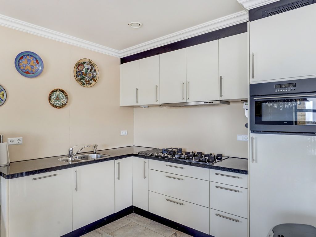 Aangrenzend ligt de open keuken in L-opstelling, met lichte kastfronten en een donker werkblad, wat een moderne en neutrale uitstraling geeft. De keuken is volledig uitgerust met inbouwapparatuur zoals een 5-pits gaskookplaat, afzuigkap, vaatwasser, combimagnetron en koelkast, met voldoende opbergruimte.