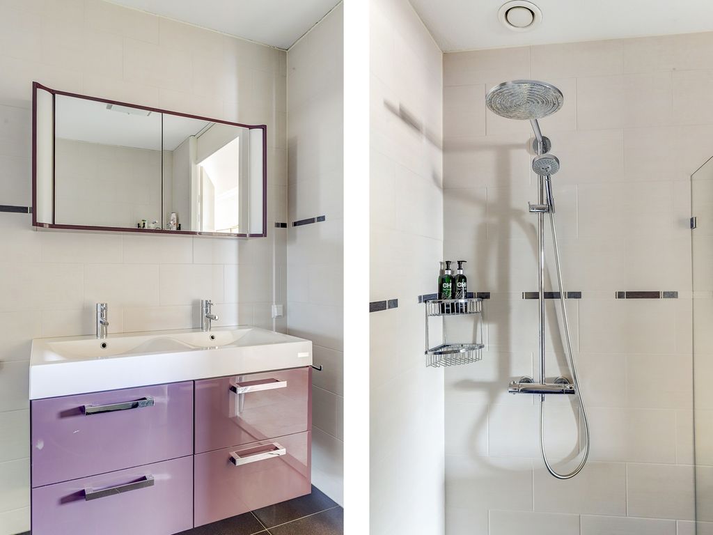 De badkamer, bereikbaar vanuit de centrale hal, is voorzien van een dubbele wastafel met meubel, een ruime inloopdouche en neutraal tegelwerk. Daarnaast is er een apart toilet aanwezig