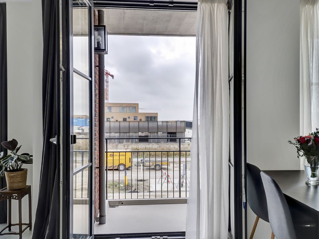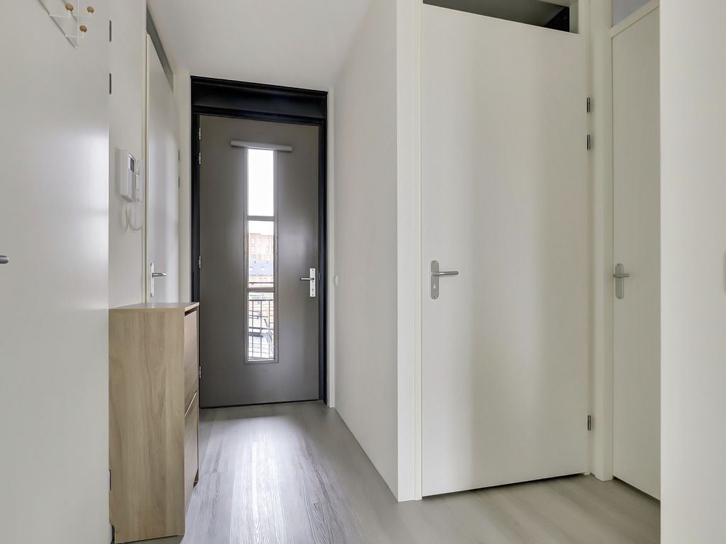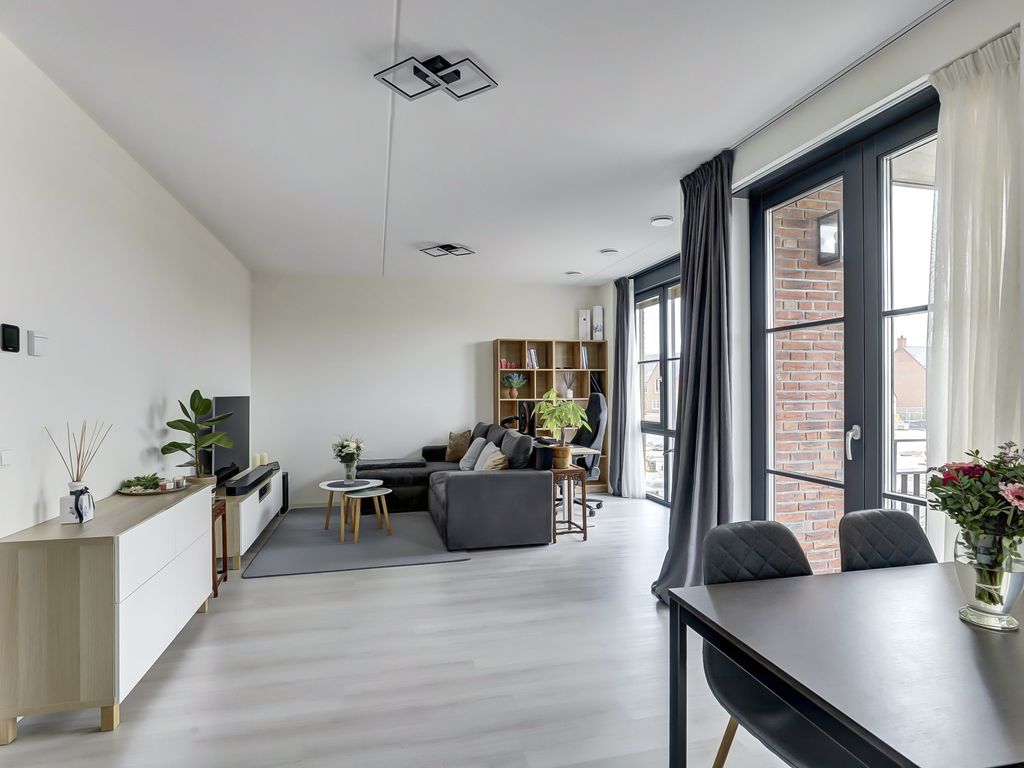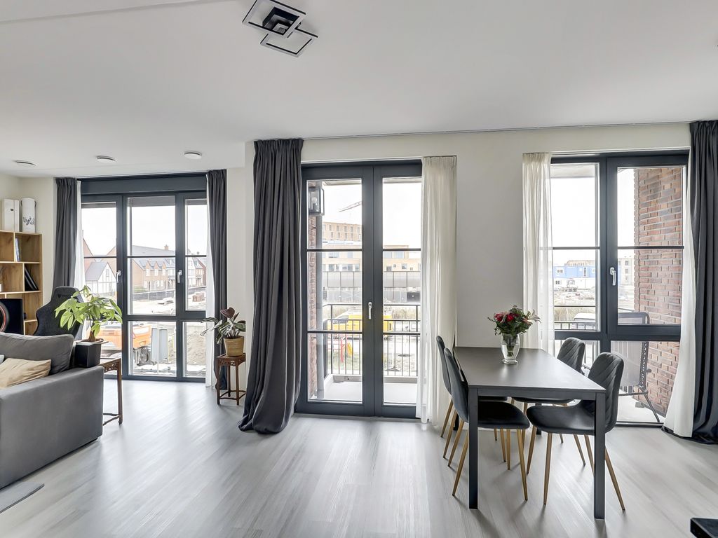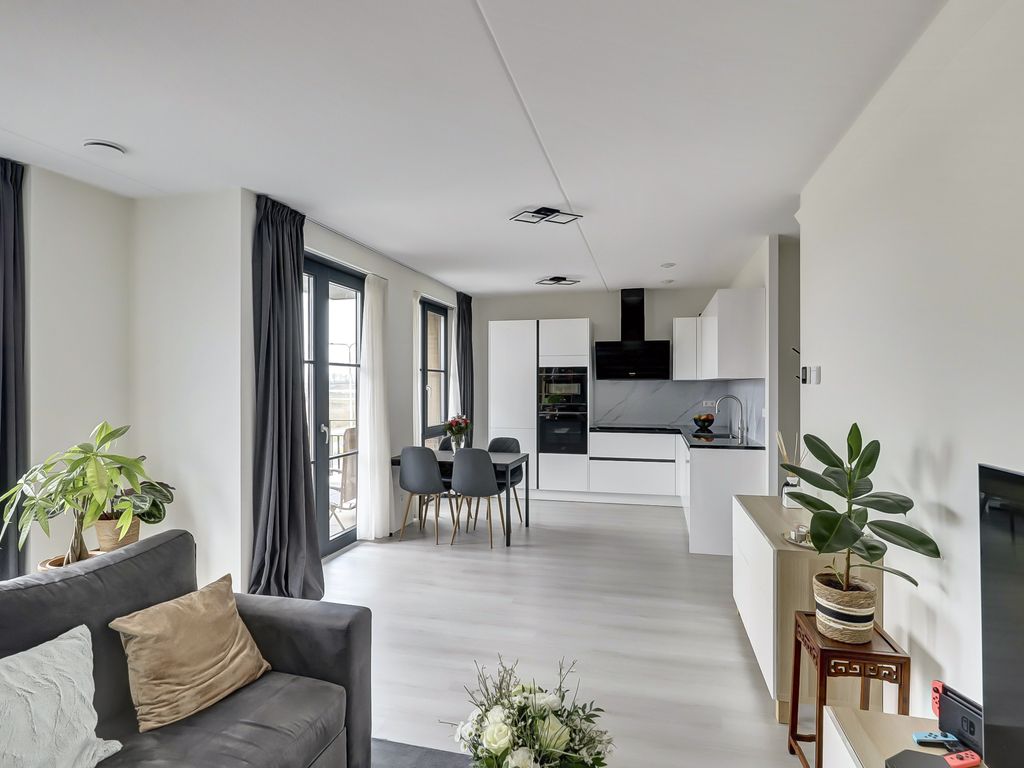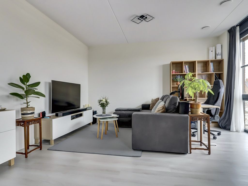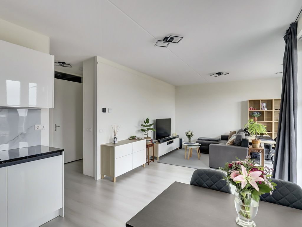 Via de galerij op de eerste verdieping wordt de woning betreden. De entree geeft toegang tot een hal die fungeert als centraal punt van het appartement. Vanuit hier zijn alle vertrekken bereikbaar. De woonkamer is ruim opgezet en profiteert van grote raampartijen, waardoor er veel daglicht binnenvalt. De lichte vloer en neutrale wandafwerking zorgen voor een rustige, moderne uitstraling en bieden een goede basis voor verschillende interieurstijlen. Er is voldoende ruimte voor zowel een comfortabele zithoek als een eethoek. Een deel van de woonkamer is momenteel ingericht als werkplek, wat de ruimte ook zeer geschikt maakt voor thuiswerken.