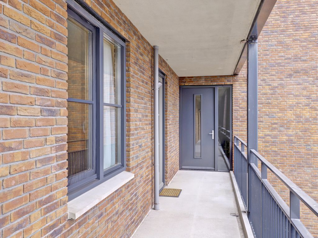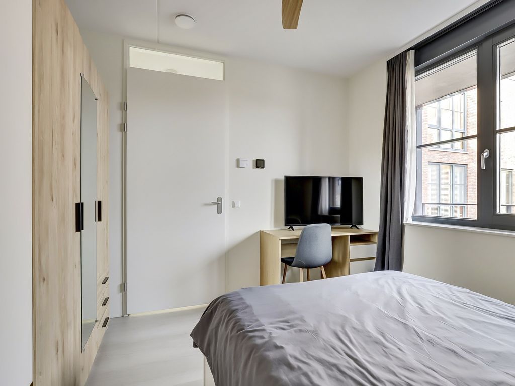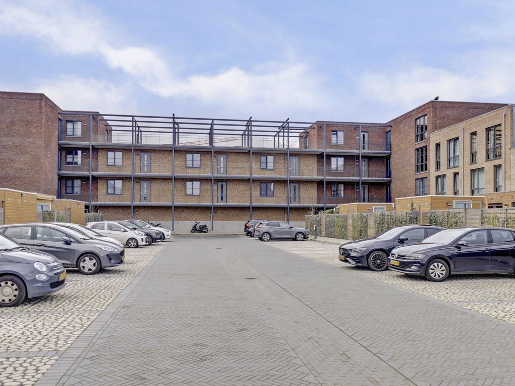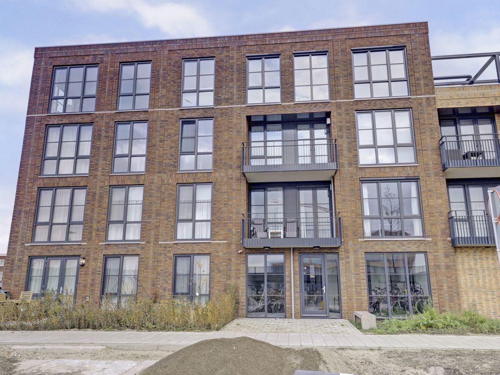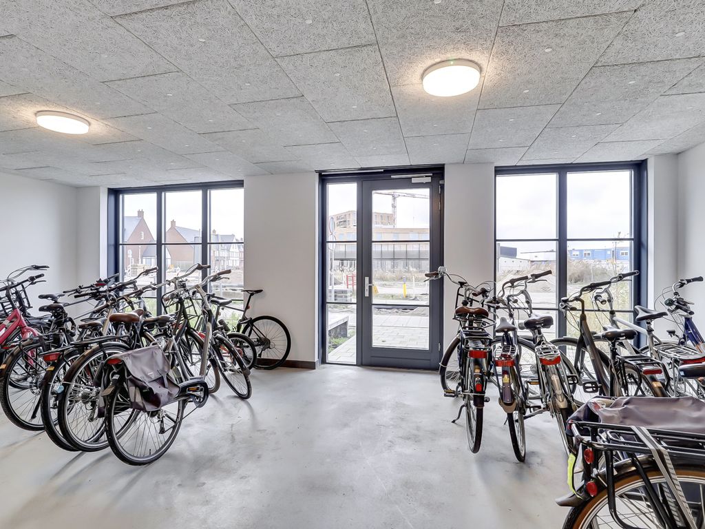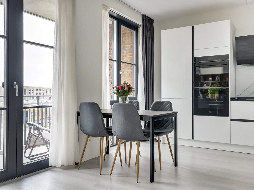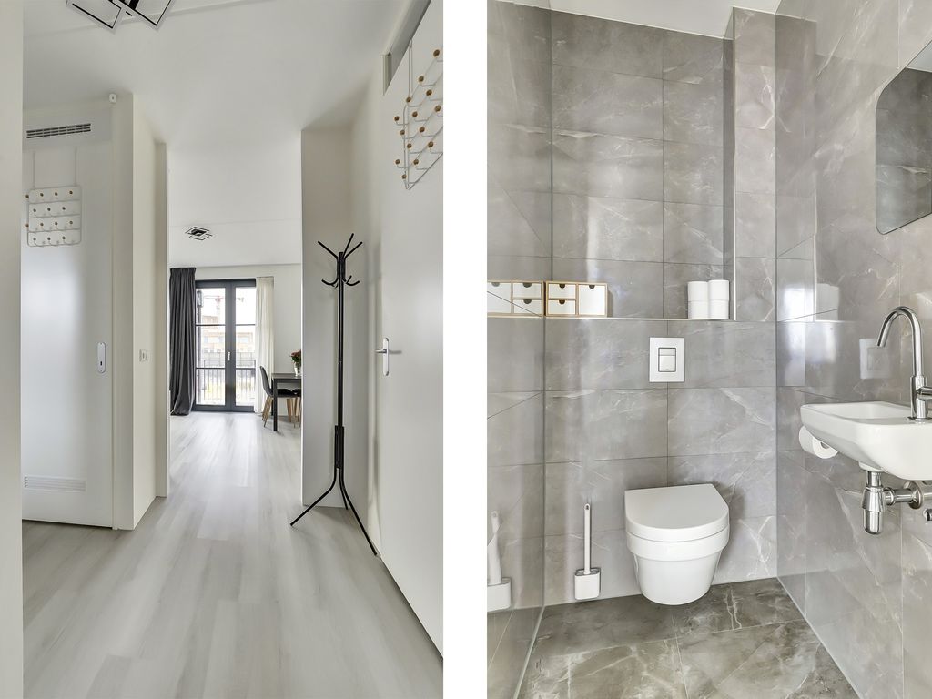 Via de galerij op de eerste verdieping wordt de woning betreden. De entree geeft toegang tot een hal die fungeert als centraal punt van het appartement. Vanuit hier zijn alle vertrekken bereikbaar. De woonkamer is ruim opgezet en profiteert van grote raampartijen, waardoor er veel daglicht binnenvalt. De lichte vloer en neutrale wandafwerking zorgen voor een rustige, moderne uitstraling en bieden een goede basis voor verschillende interieurstijlen. Er is voldoende ruimte voor zowel een comfortabele zithoek als een eethoek. Een deel van de woonkamer is momenteel ingericht als werkplek, wat de ruimte ook zeer geschikt maakt voor thuiswerken.
