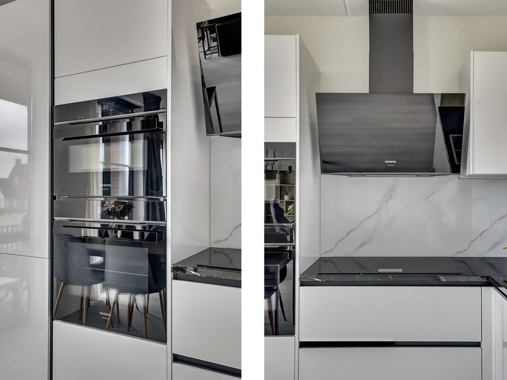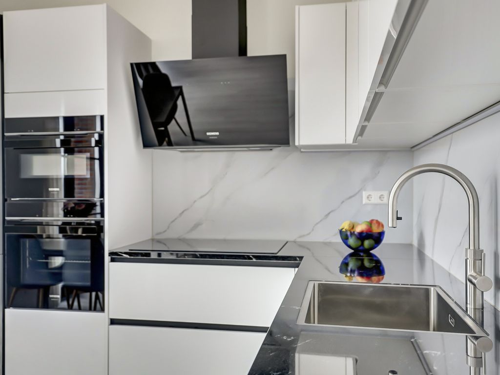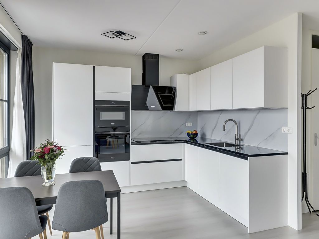 De open keuken sluit naadloos aan op de woonkamer en is uitgevoerd in een strakke, witte kleurstelling. De keuken is voorzien van luxe inbouwapparatuur, waaronder een Quooker, 81cm inductiekookplaat voor 5 pannen, afzuigschouw, oven, combi-oven, koelvriescombinatie en vaatwasser (allen Siemens Topline). Het composiet werkblad en de achterwand geven het geheel een luxe en verzorgde uitstraling, terwijl de opstelling zorgt voor voldoende werk- en kastruimte.