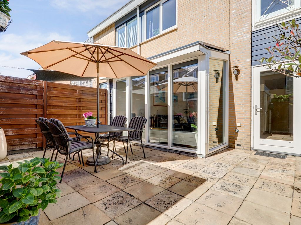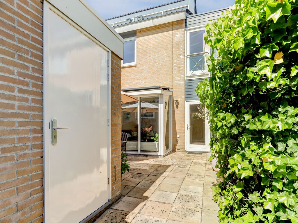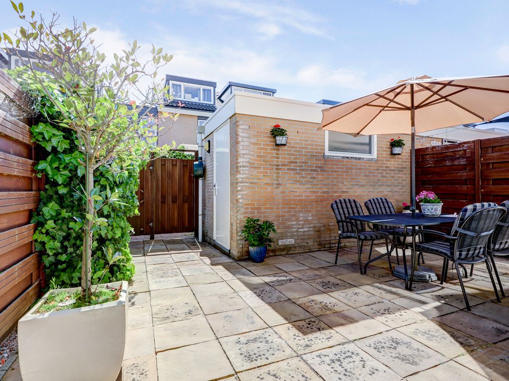 De fraai aangelegde achtertuin (ca. 45 m²) is onderhoudsvriendelijk betegeld, voorzien van een berging en een handige achterom. Dankzij de ligging biedt de tuin zowel zon als schaduw en vormt het een verlengstuk van de serre en woonkamer. Aan de voorzijde is er voldoende parkeergelegenheid op eigen terrein.