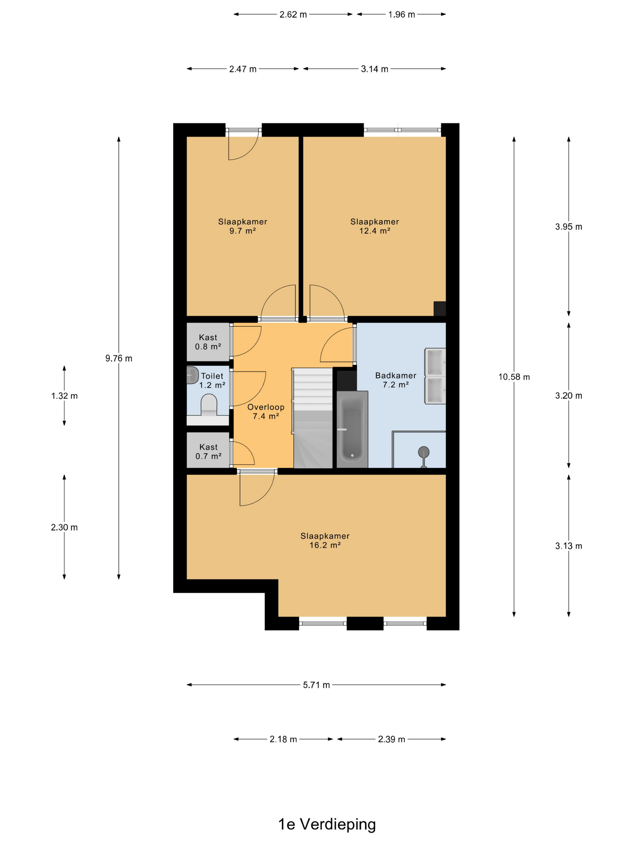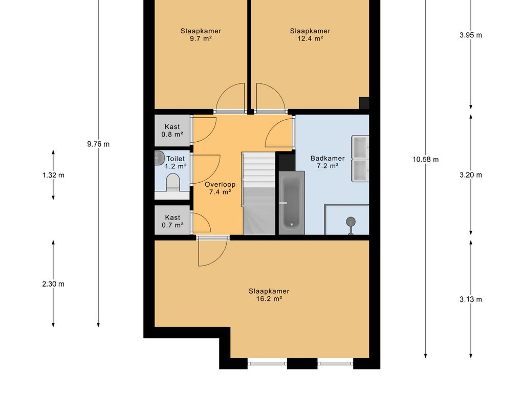 De overloop geeft toegang tot drie slaapkamers, een tweede toilet en twee vaste kasten. De hoofdslaapkamer (ca. 16 m²) ligt aan de voorzijde, terwijl aan de achterzijde nog twee slaapkamers te vinden zijn van ca. 12 m² en ca. 10 m² — de laatste met een charmant Frans balkon. De hele verdieping is afgewerkt met een warme larix houten vloer.