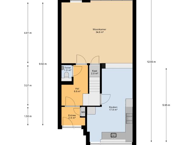 Aan de voorzijde bevindt zich de luxe open keuken met kookeiland en composiet werkblad, uitgevoerd in 2019 en voorzien van hoogwaardige inbouwapparatuur van Siemens, een Quooker en een 5-pits gasfornuis. De keuken is ruim opgezet (circa 18 m²) en biedt volop werk- en bergruimte.