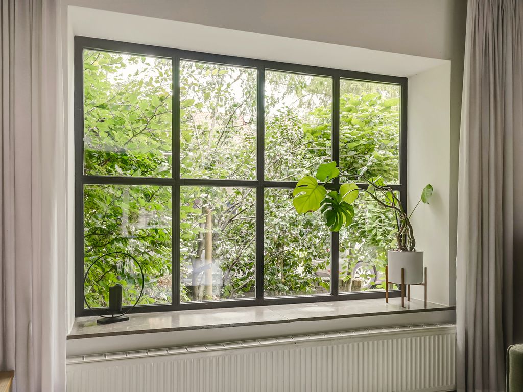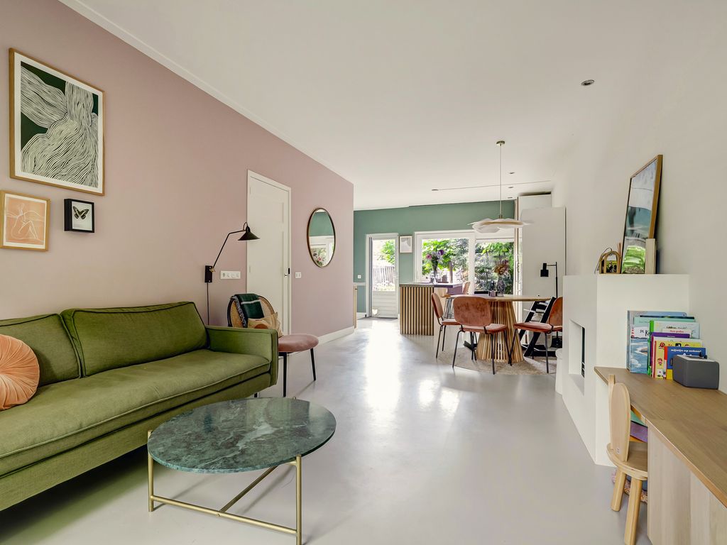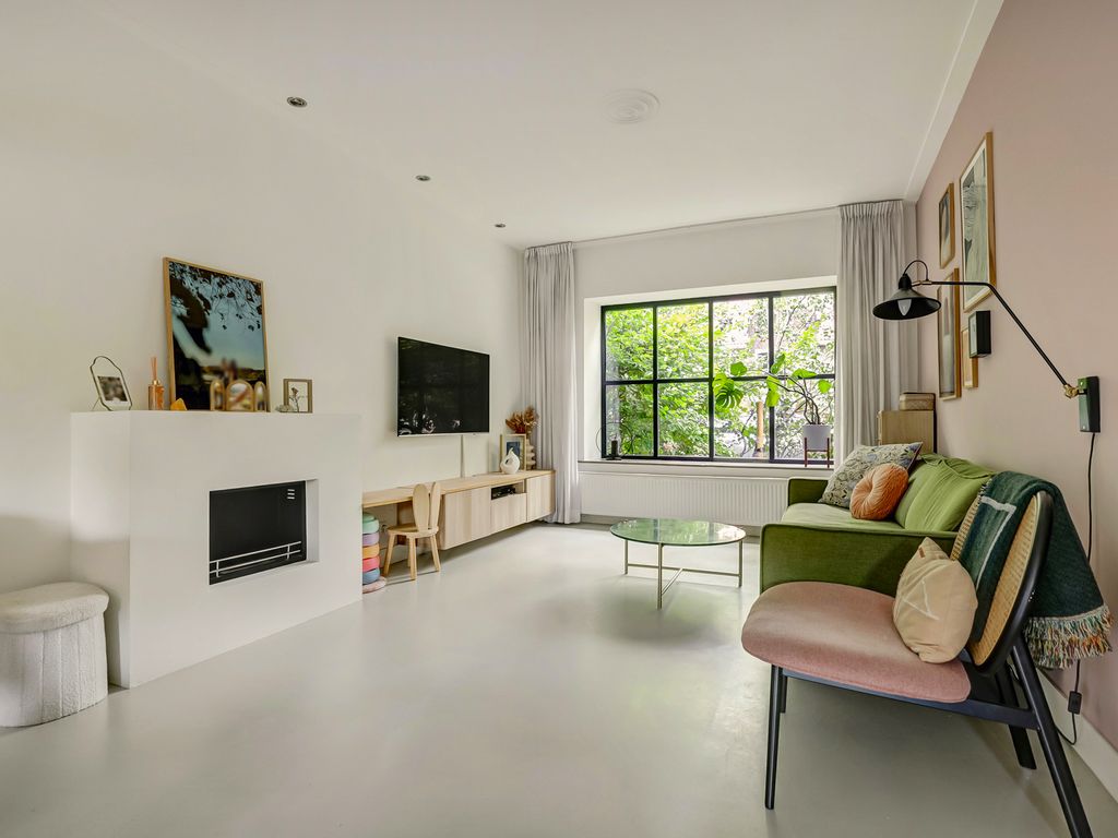 De woonkamer valt op door de rustige afwerking met een naadloze gietvloer, glad gestuukte wanden en een strakke schouw. Het grote raam aan de voorzijde geeft veel licht en een eigentijdse uitstraling.