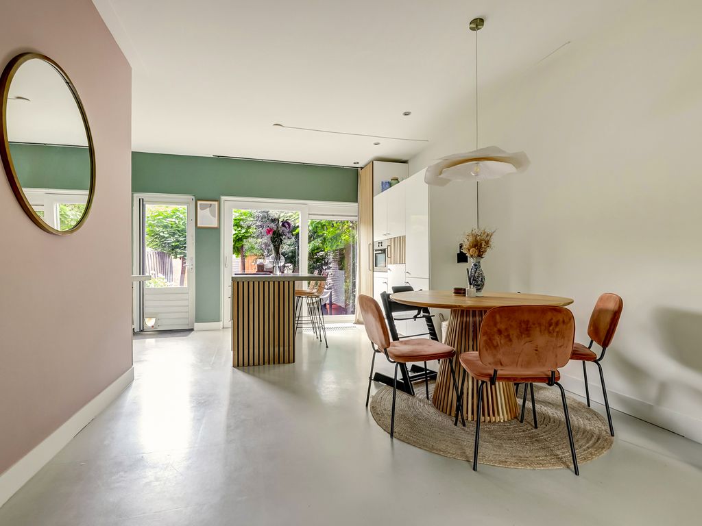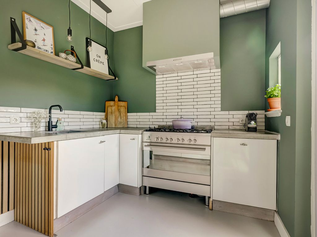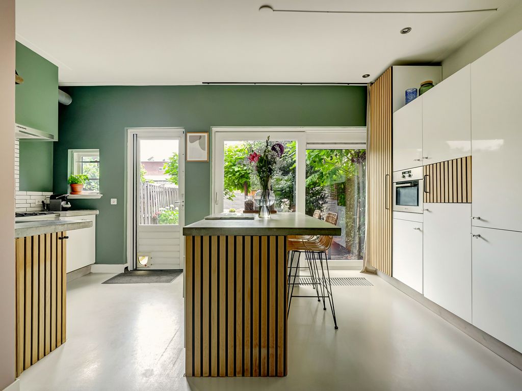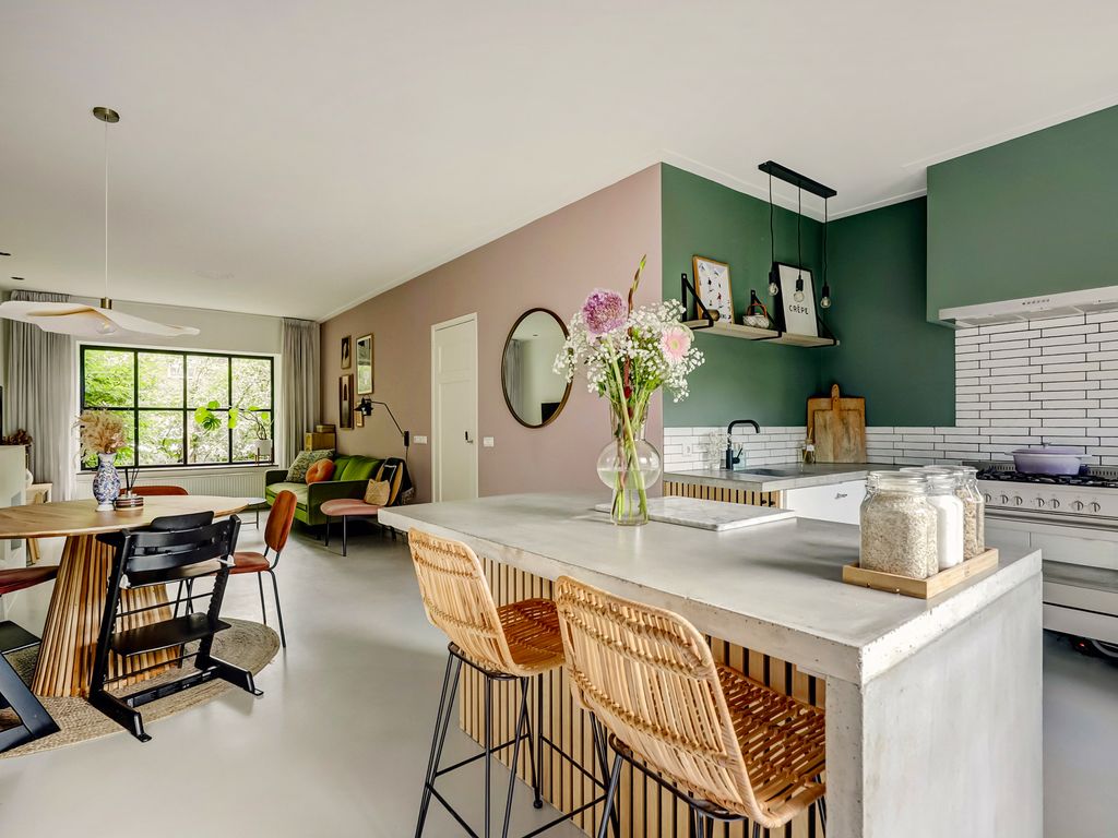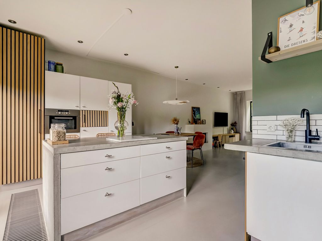 Aan de tuinzijde ligt de open leefkeuken. Een echt hart van het huis! De keuken is ingericht met een royaal kook–/spoeleiland met zitplekken, betonlook werkbladen en een compleet pakket aan inbouwapparatuur, waaronder een breed fornuis met oven, afzuigkap, vaatwasser en koelkast. Via de achterdeur stapt u direct het terras en de tuin in. Ideaal voor wie graag binnen en buiten laat overlopen.