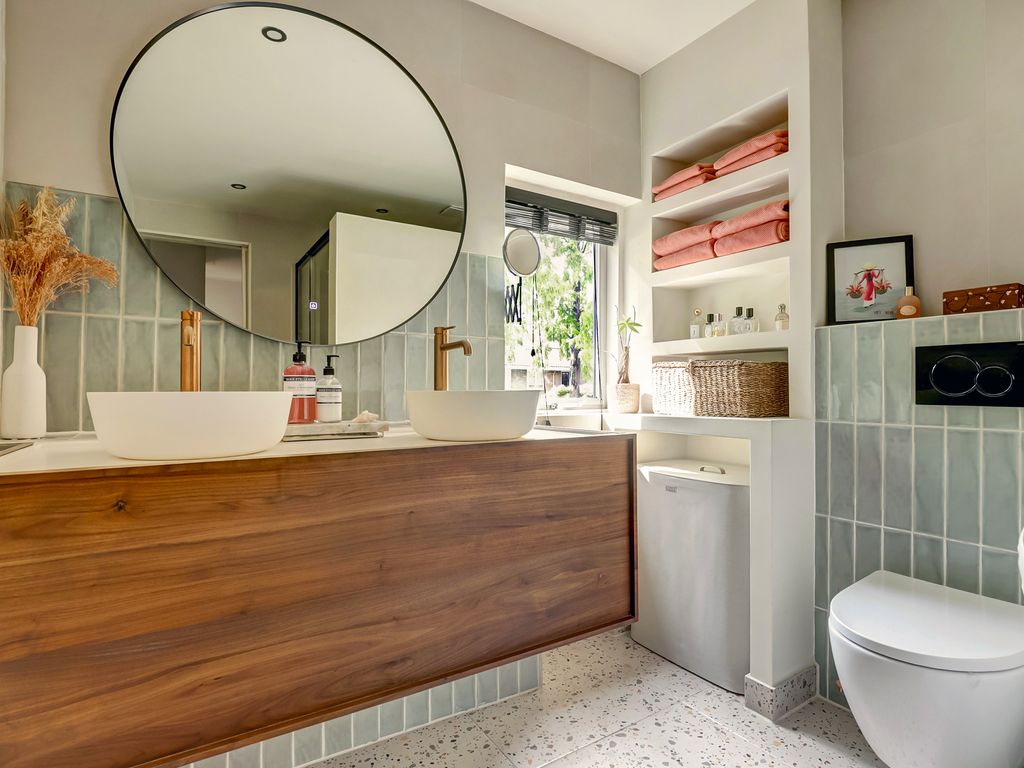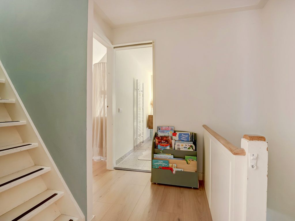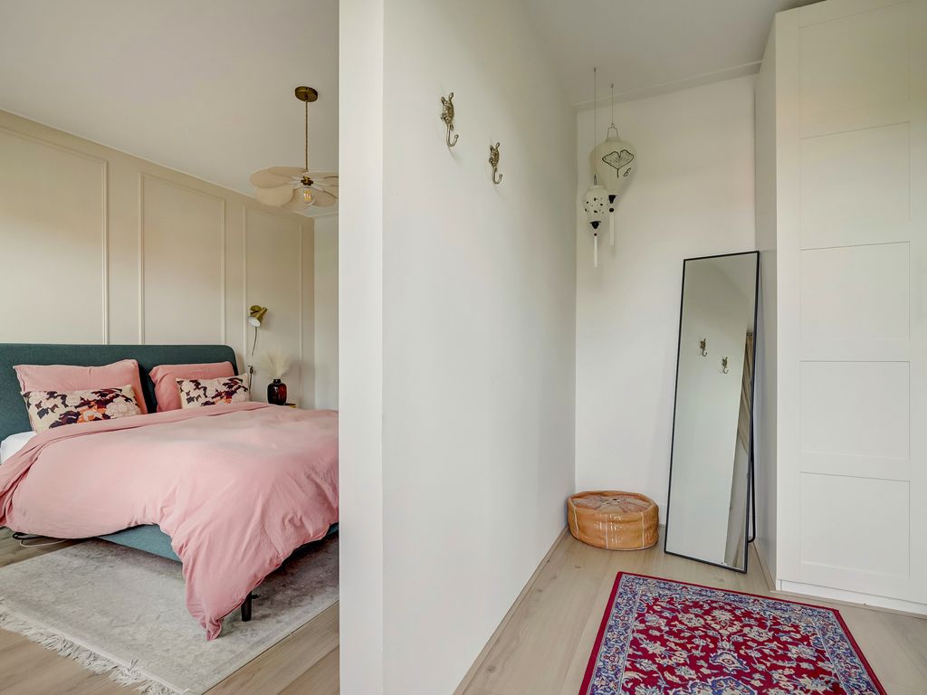 De overloop geeft toegang tot twee zeer ruime slaapkamers over de volledige breedte van de woning. De master bedroom aan de achterzijde beschikt over een klein balkon en een inloopkast. De badkamer is recent stijlvol vernieuwd met terrazzo-look vloertegels, een fraai houten dubbel wastafelmeubel, grote inloopdouche met glazen wand en regendouche, designradiator en daglicht. Alles in rustige, moderne kleurstelling.