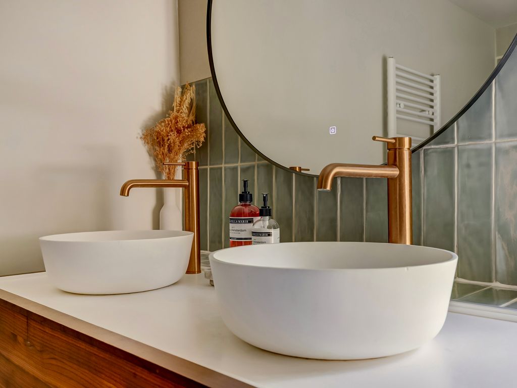* Luxe badkamer met dubbele wastafel en riante inloopdouche;