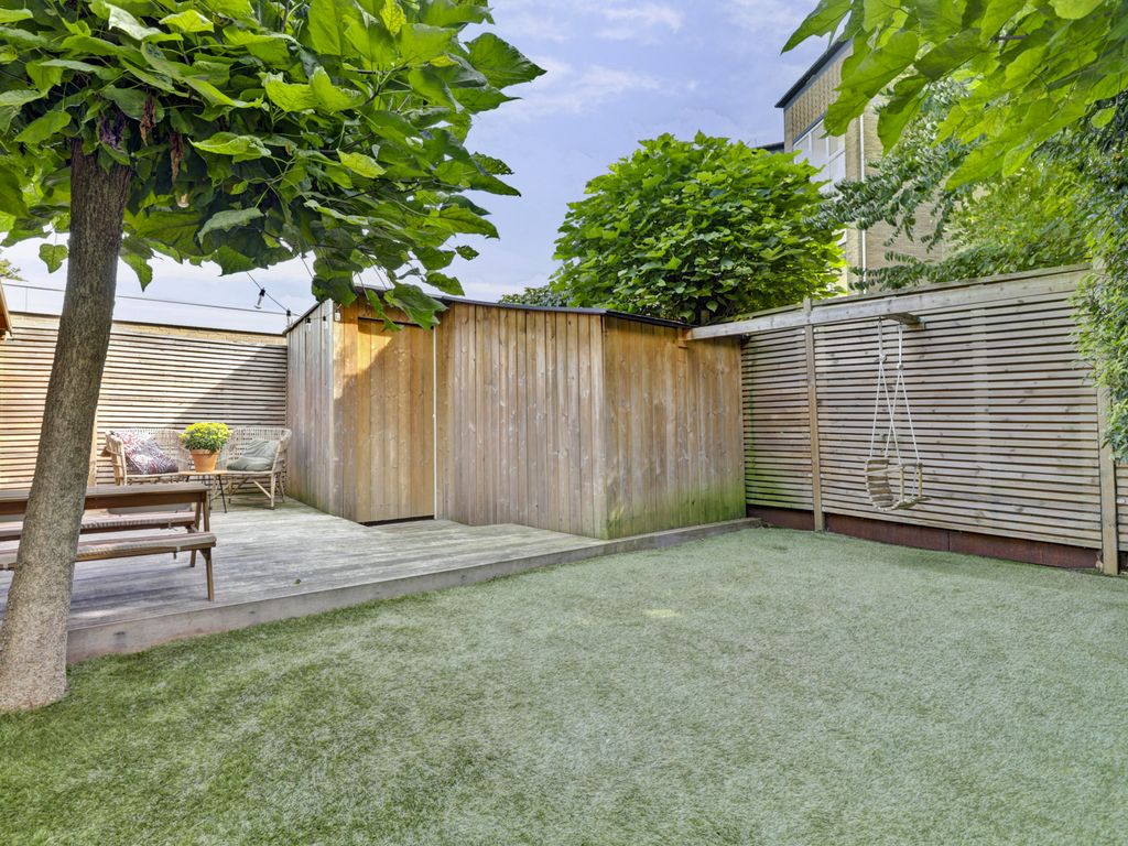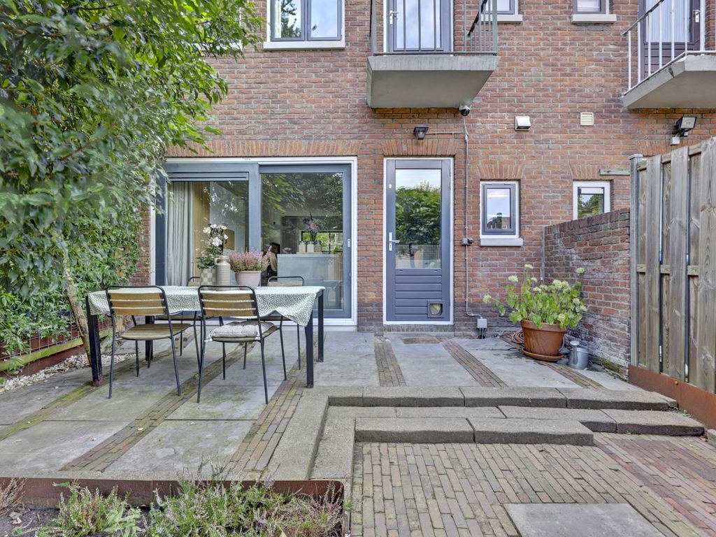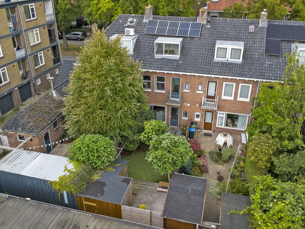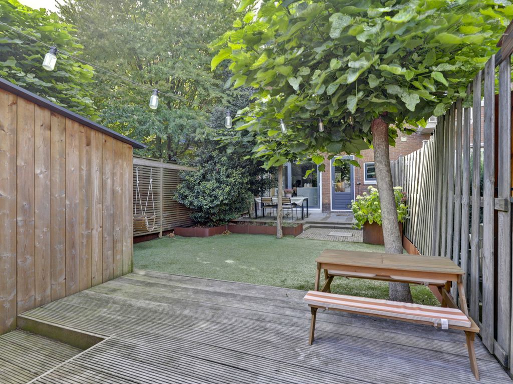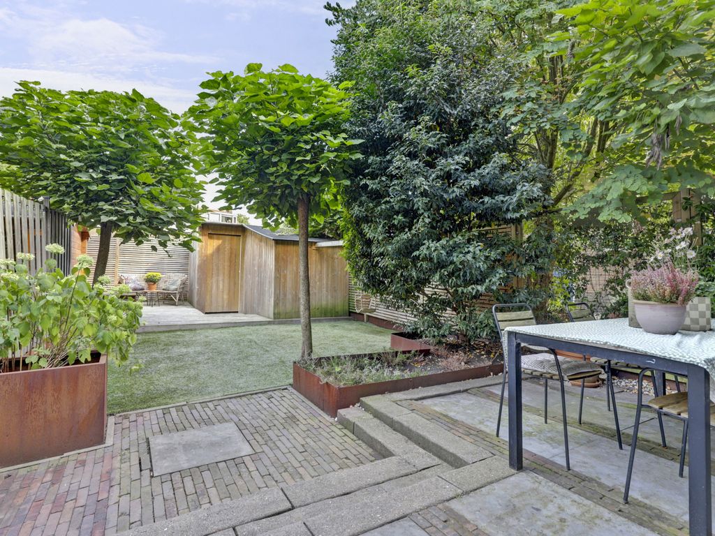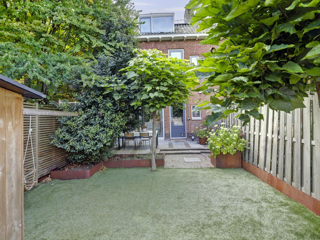 De achtertuin is diep en onderhoudsvriendelijk aangelegd met een royaal terras aan het huis en een groot stuk grond waar zowel kinderen fijn kunnen spelen, als volwassenen met vrienden kunnen eten en borrelen. Achterin staat een houten berging en er is een achterom naar het achterpad. De tuin biedt veel privacy en de hele dag door fijne plekjes om te zitten.