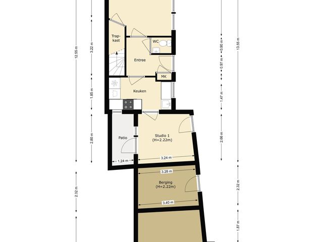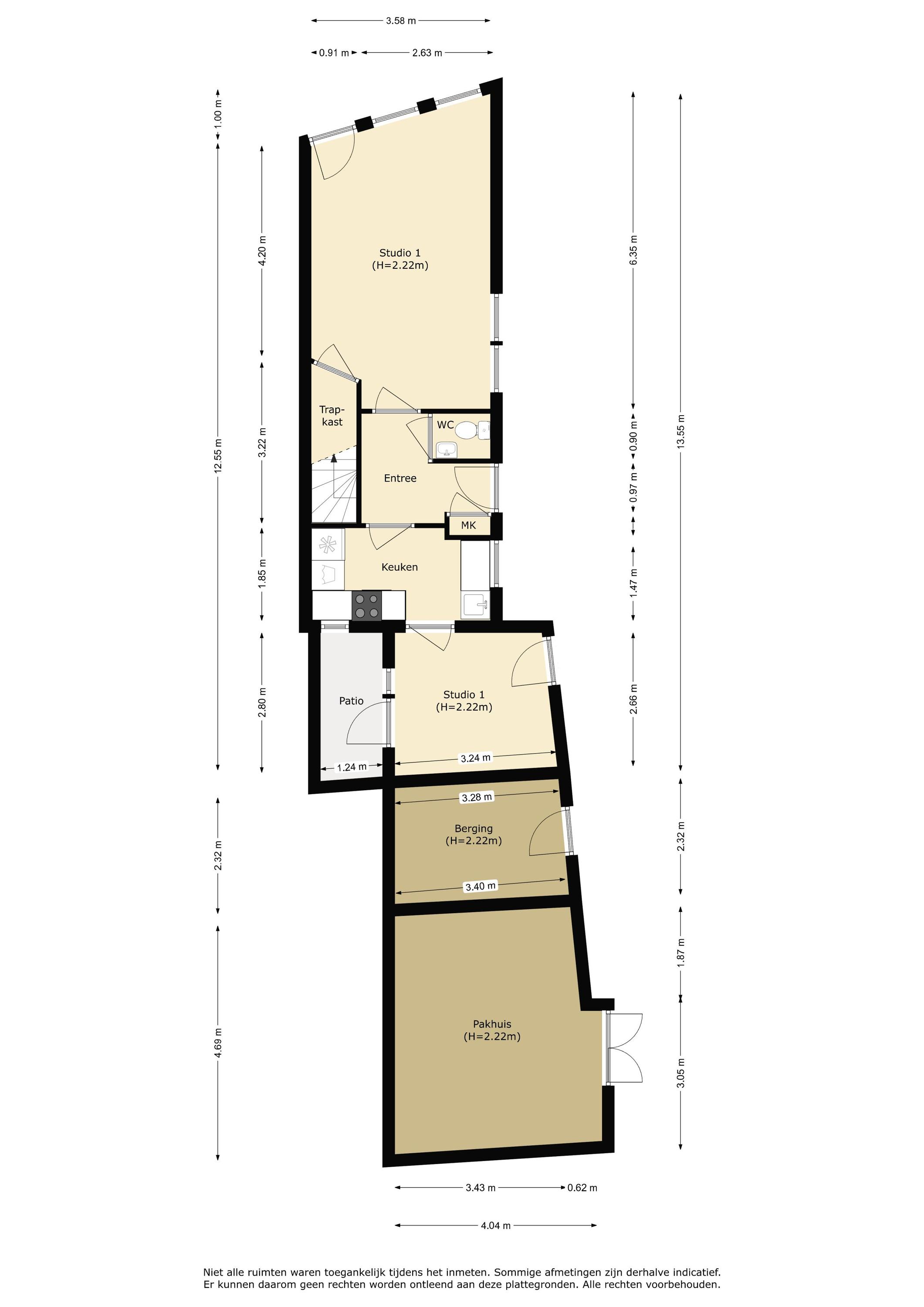 Pakhuis: ca. 4.69x4.04/3.43m.