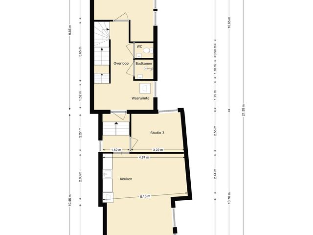 Studio 3 bestaande uit een slaapkamer van ca. 8m2 en living van ca. 36m2 (inclusief keuken) aan de achterzijde van het pand gelegen met eigen keuken voorzien van aansluiting wasmachine en wasbak.