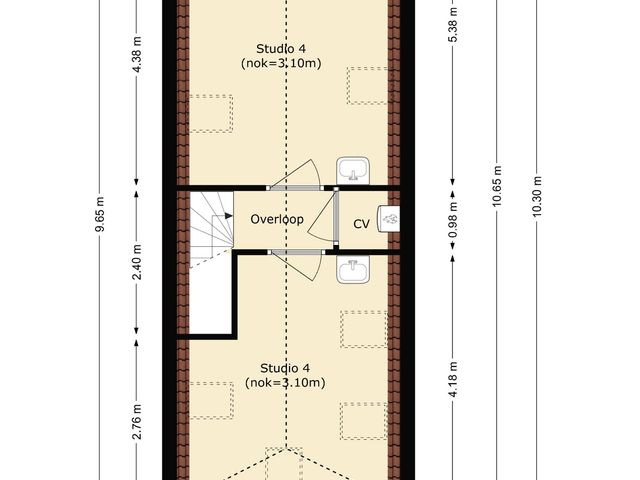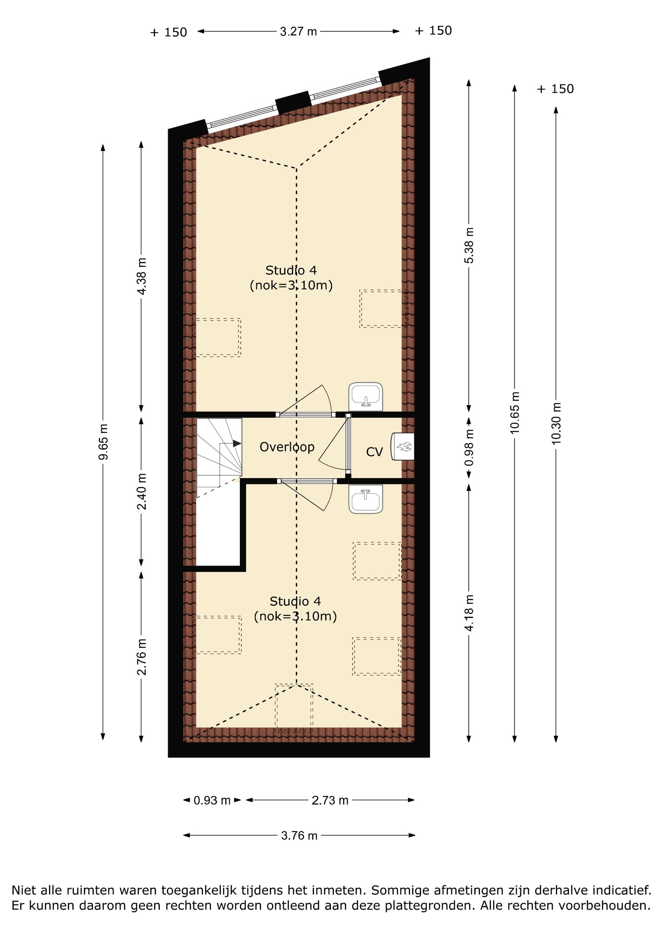 Studio 4: slaapkamer ca. 5.38/4.38x3.76m en woonkamer ca. 4.18/2.76x3.76m.