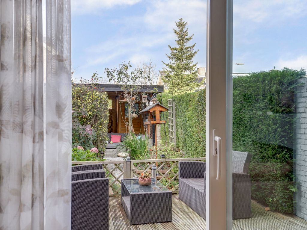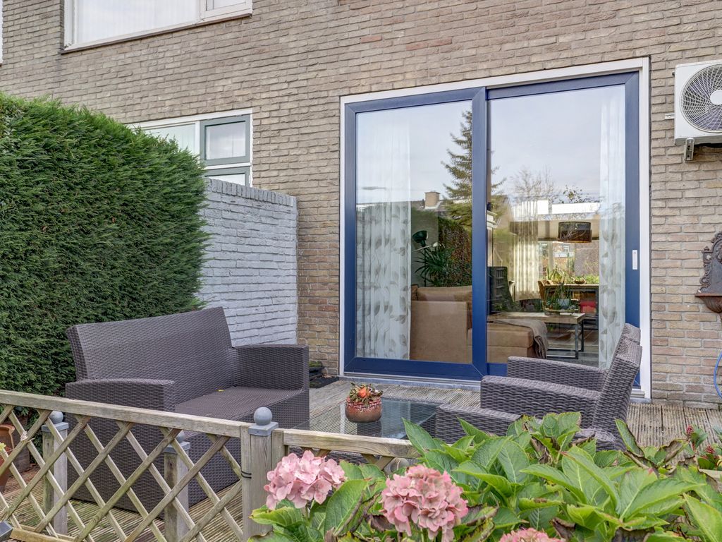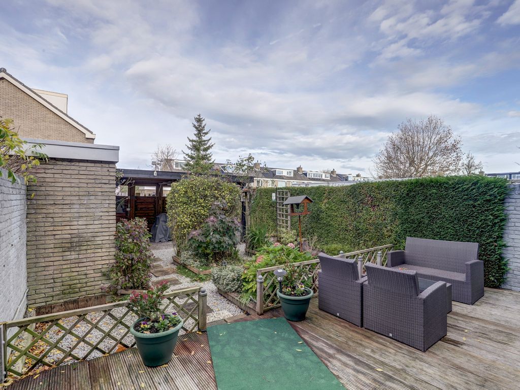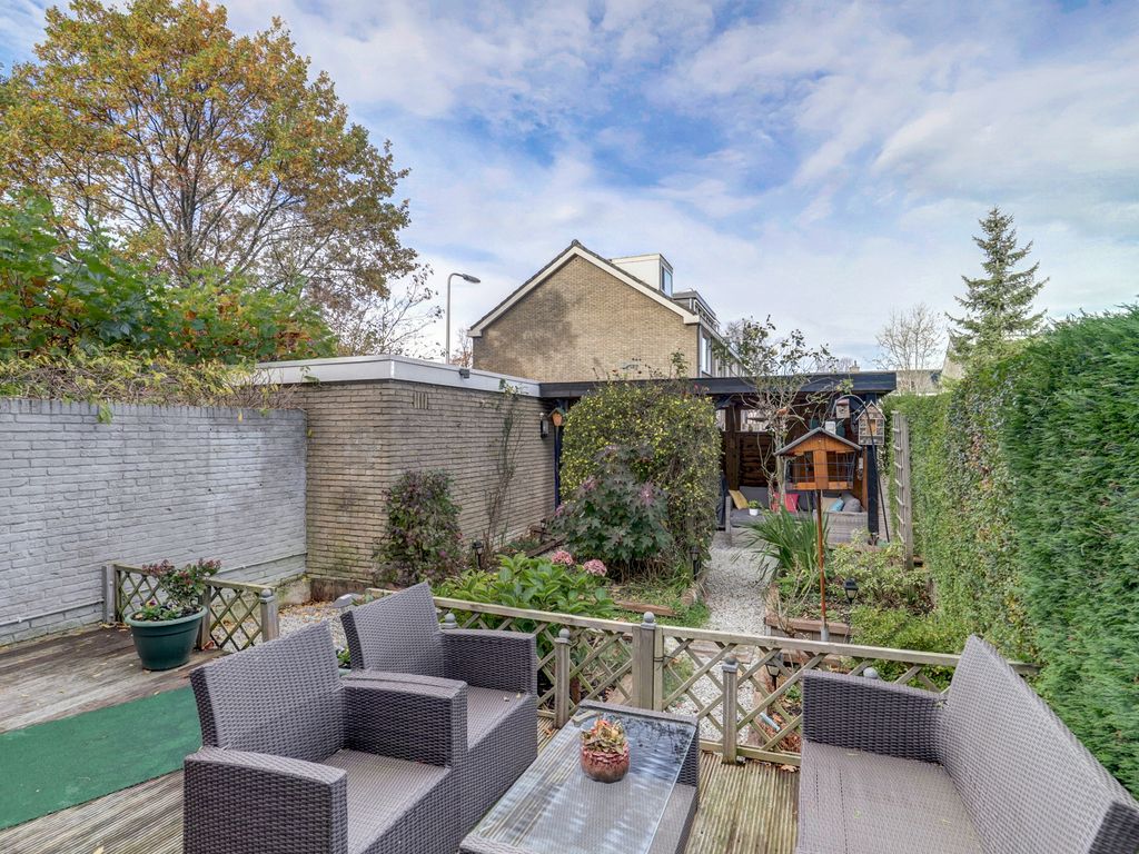 Via de schuifpui in de woonkamer en de deur in de keuken bereikt u de zonnige achtertuin. Direct achter de woning ligt een houten vlonder met zitgedeelte, perfect voor een loungeset. De tuin is speels aangelegd met groene borders, een pad van licht siergrind en een houten afscheiding aan de ene zijde en een groene haag aan de andere zijde, wat veel privacy biedt.