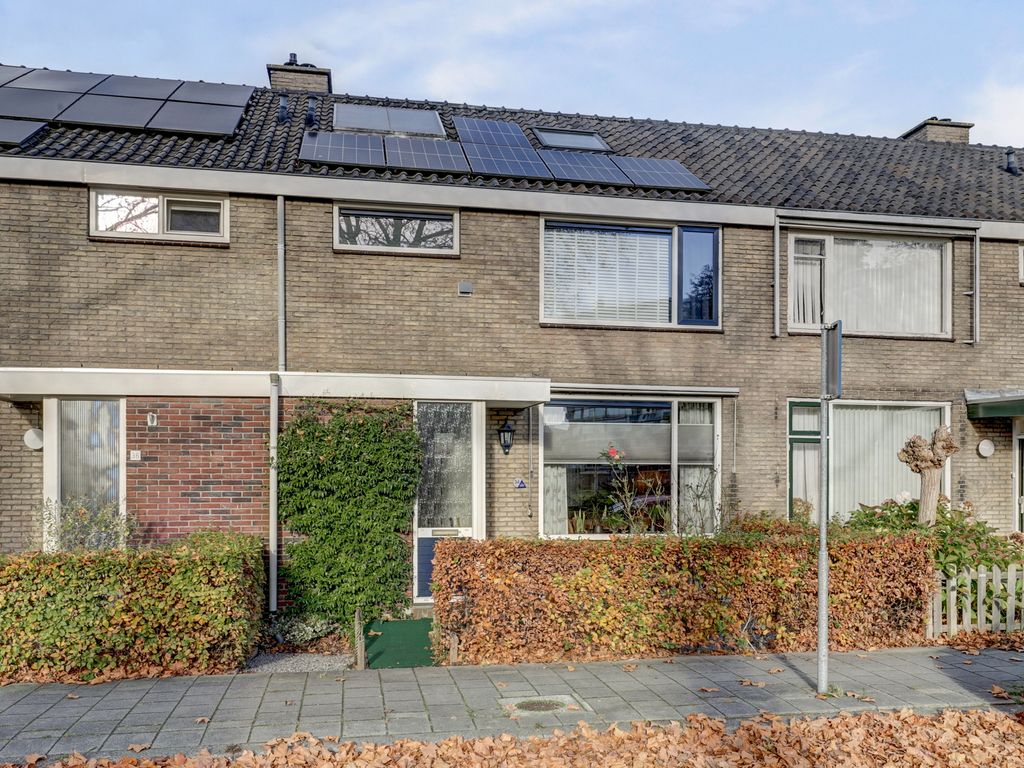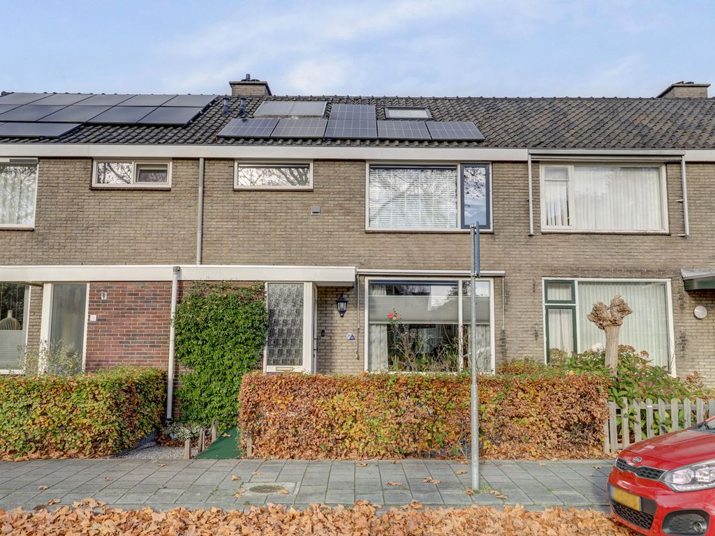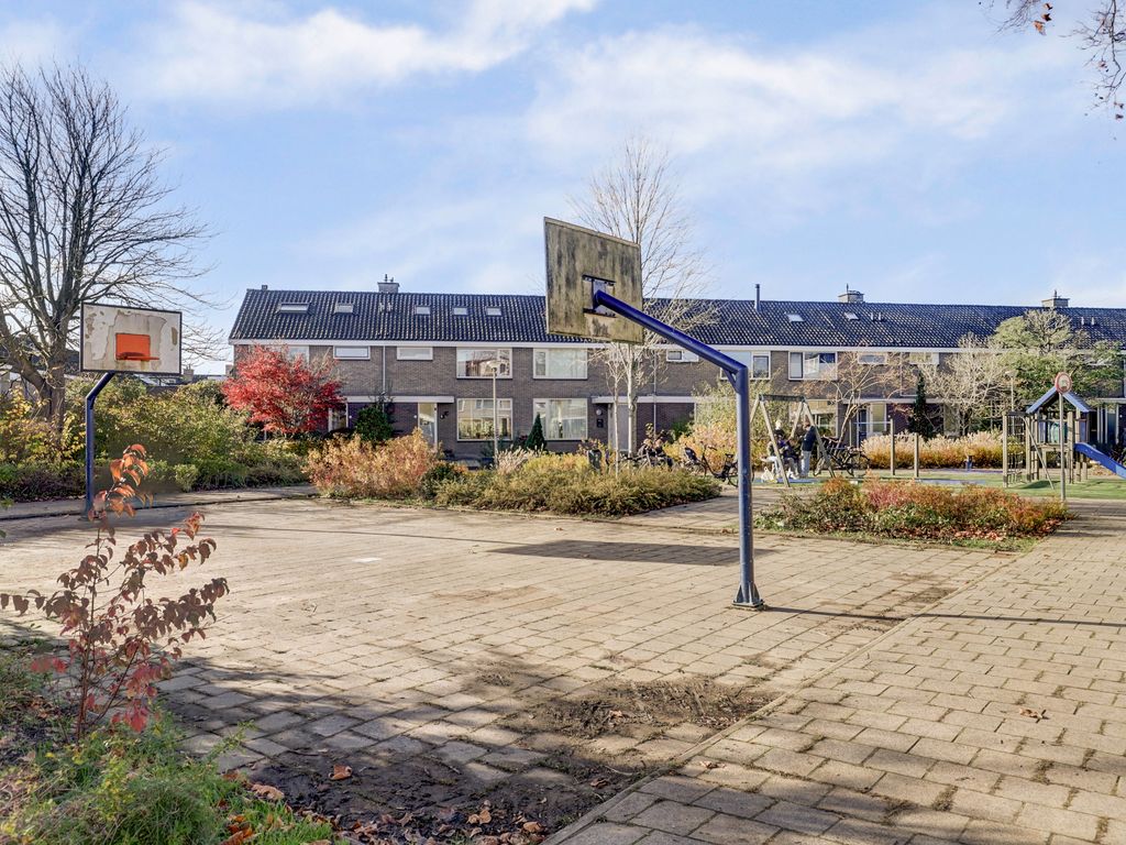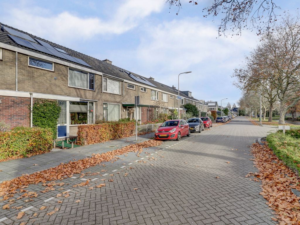 Via de schuifpui in de woonkamer en de deur in de keuken bereikt u de zonnige achtertuin. Direct achter de woning ligt een houten vlonder met zitgedeelte, perfect voor een loungeset. De tuin is speels aangelegd met groene borders, een pad van licht siergrind en een houten afscheiding aan de ene zijde en een groene haag aan de andere zijde, wat veel privacy biedt.