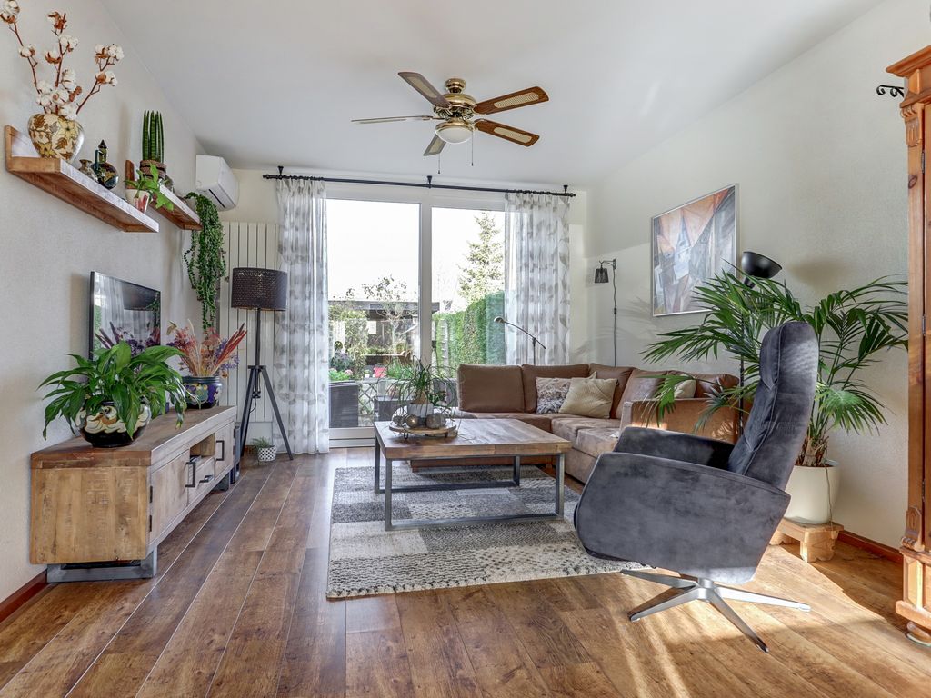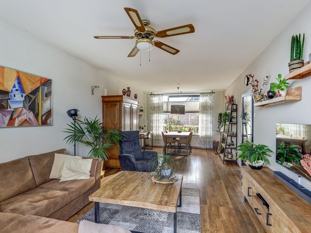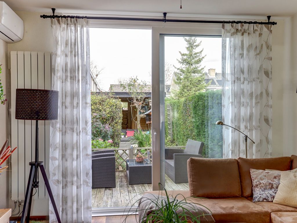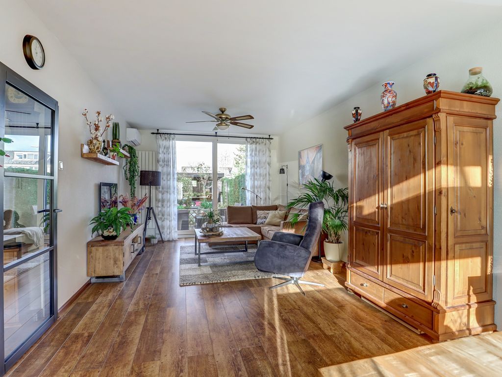 De woonkamer is een royale doorzonkamer van circa 30 m². Dankzij het grote raam aan de voorzijde van de woning en de brede schuifpui aan de tuinzijde is de woonkamer heerlijk licht. De ruimte is afgewerkt met een warme houtlook vloer, lichte wanden en biedt genoeg plek voor een royale zithoek en een grote eettafel. De woonkamer is voorzien van een airco-unit voor extra comfort.