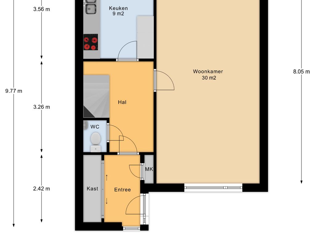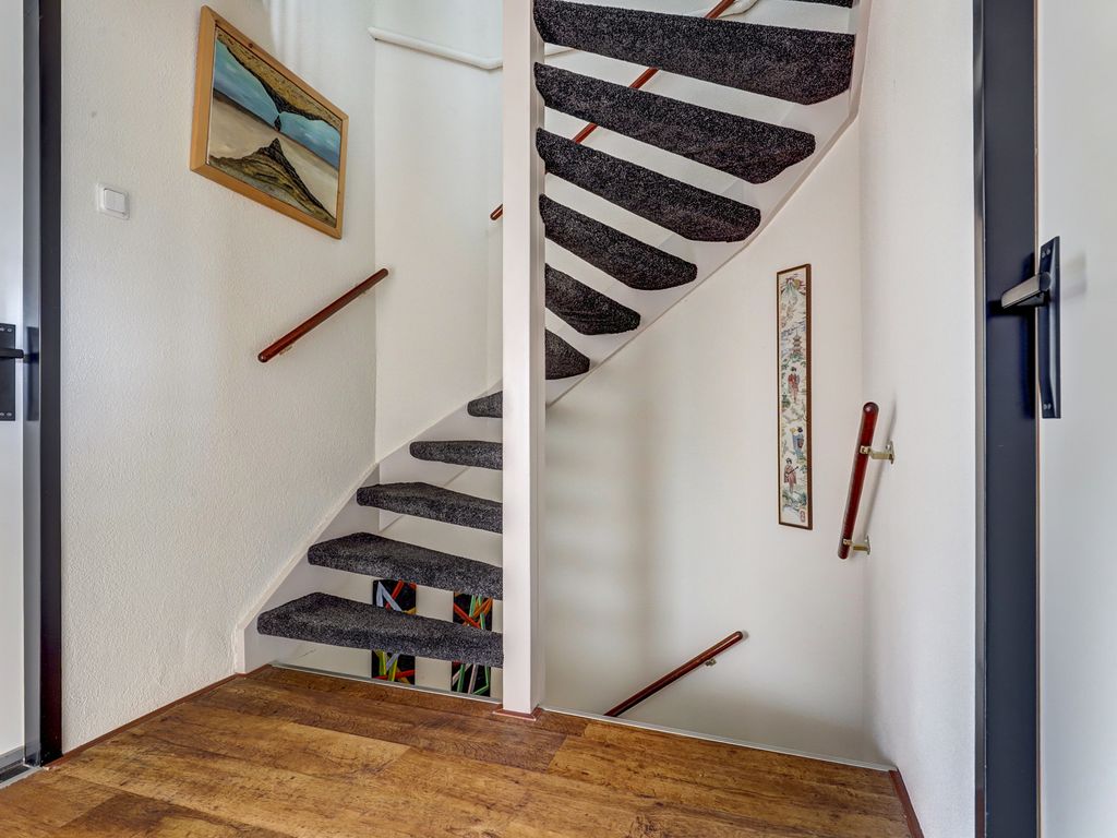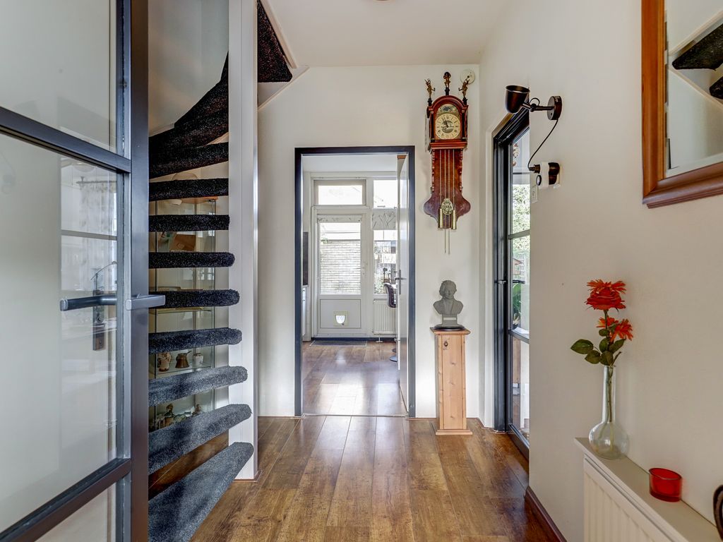Via de voortuin bereikt u de entree. In de hal vindt u de meterkast, een praktische schuifkastenwand, het toilet met fonteintje en de trapopgang naar de eerste verdieping. Vanuit de hal komt u via een moderne, zwartstalen glasdeur in de woonkamer.