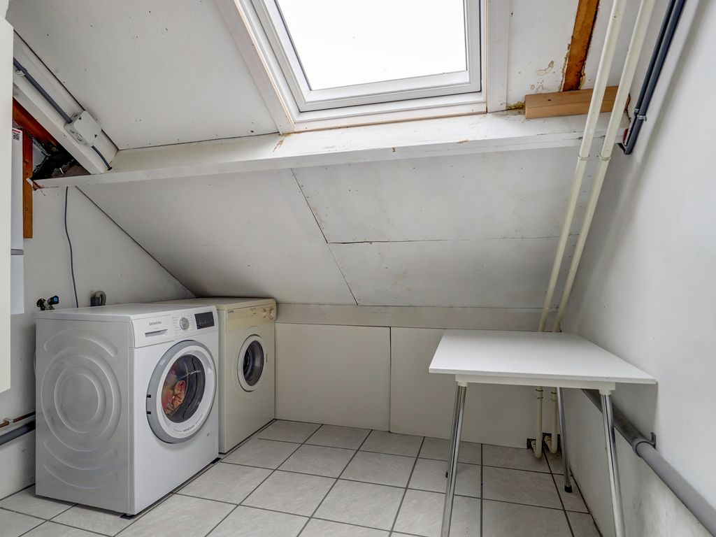 Aan de achterzijde is een berging/wasruimte met opstelplaats voor de wasmachine en droger, de cv-installatie en een dakraam. Onder de schuine kanten is extra bergruimte aanwezig.