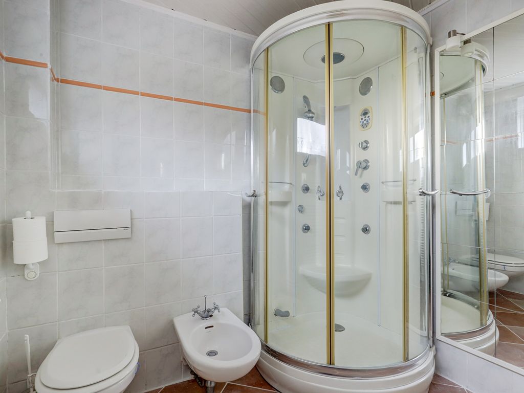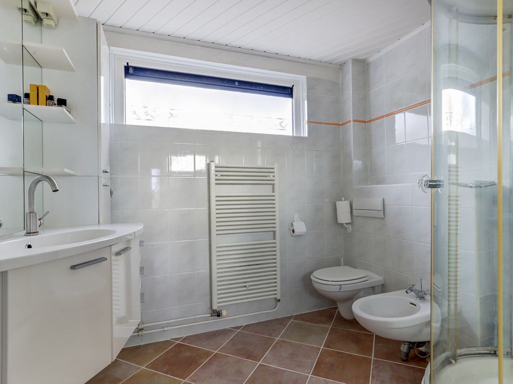 De badkamer is volledig betegeld met lichte wandtegels en terracottakleurige vloertegels. Hier vindt u een modern wit badkamermeubel met brede wastafel en spiegelkast, een wandcloset, een bidet, een handdoekradiator en een stoom/douchecabine met diverse functies. Het hoge raam zorgt voor daglicht en natuurlijke ventilatie, terwijl inbouwspots zorgen voor prettige verlichting.