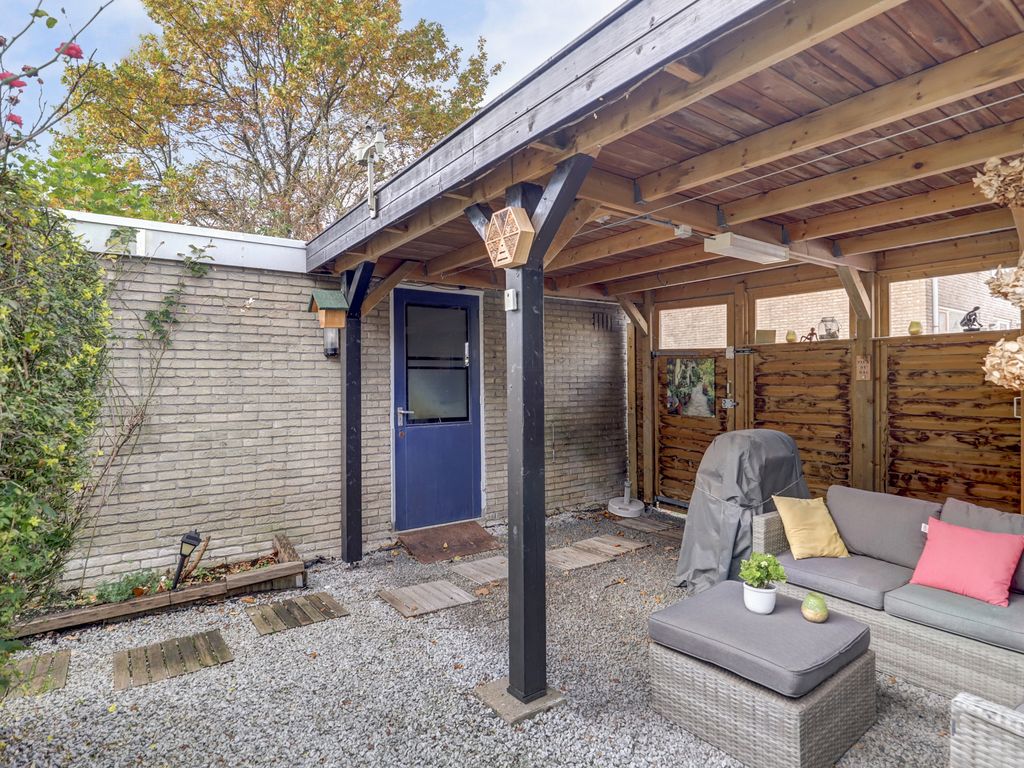 Achter in de tuin staat een ruime stenen berging met daarvoor een royale overkapping. Hier kunt u een gezellige extra zithoek creëren of uw fietsen droog stallen. Naast de berging is nog een aparte kast voor extra opslag. De tuin is diep genoeg om meerdere terrassen te maken en toch veel groen te behouden.