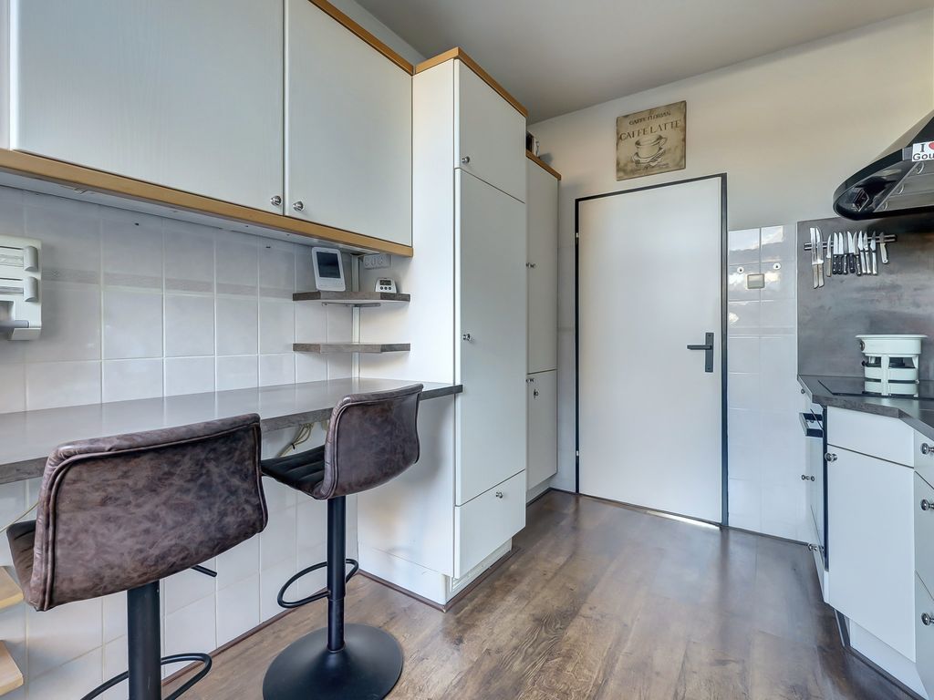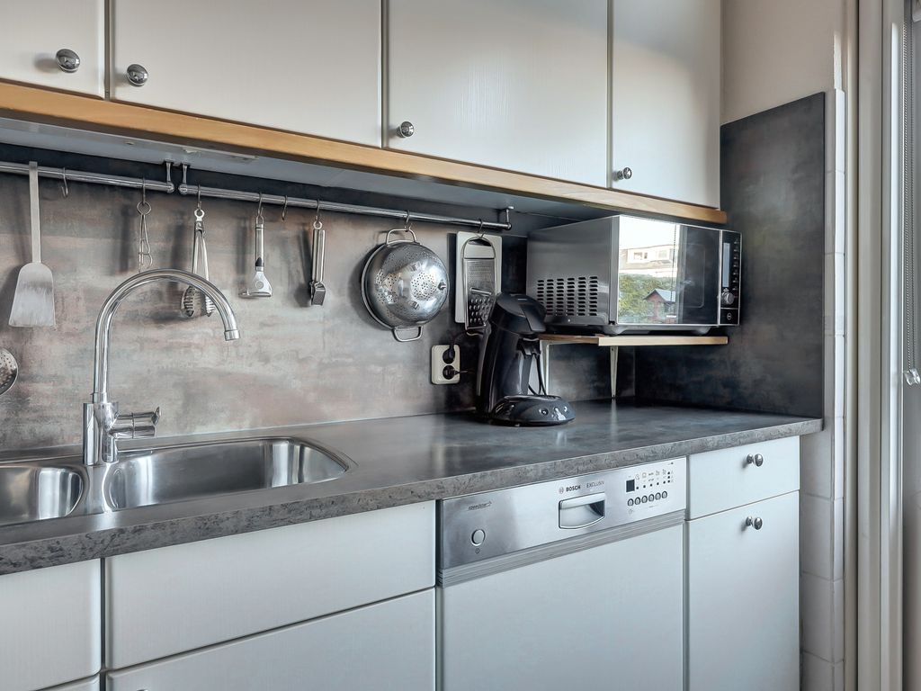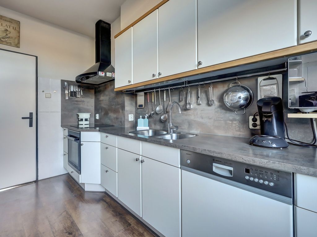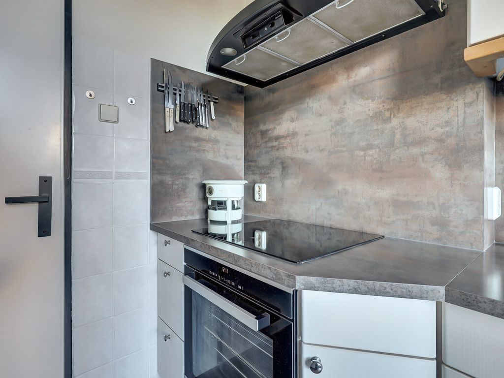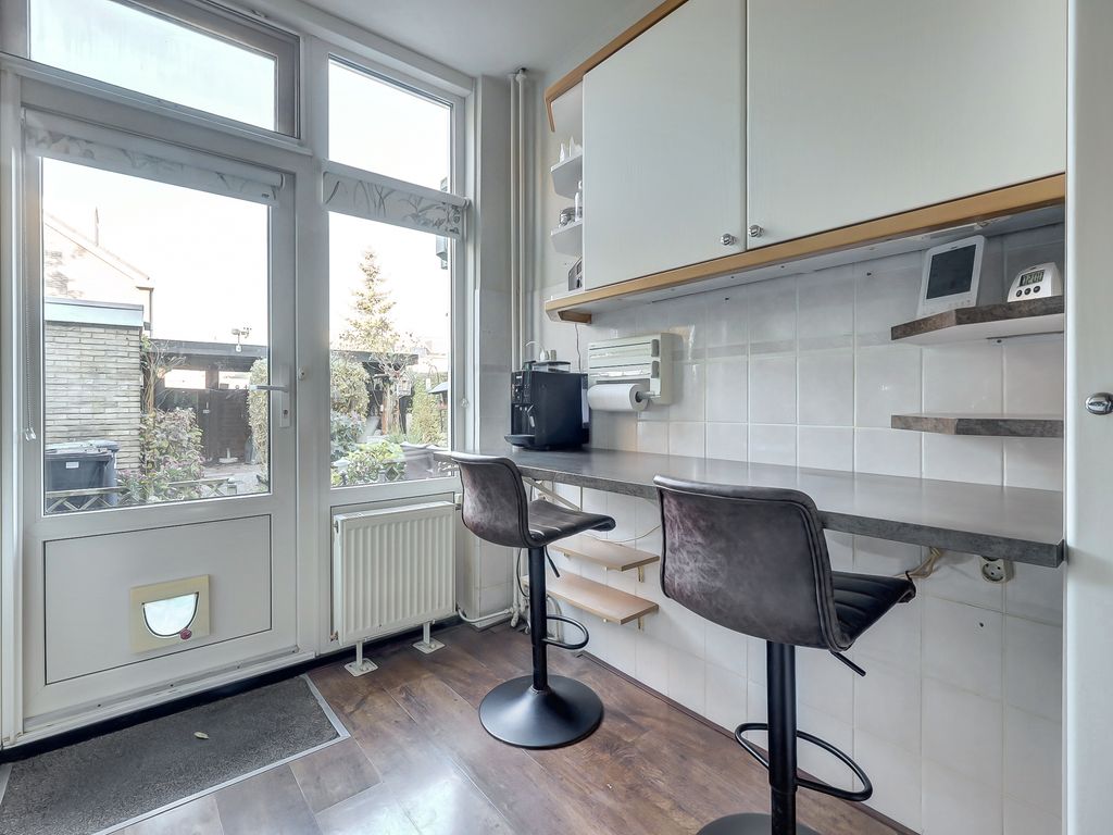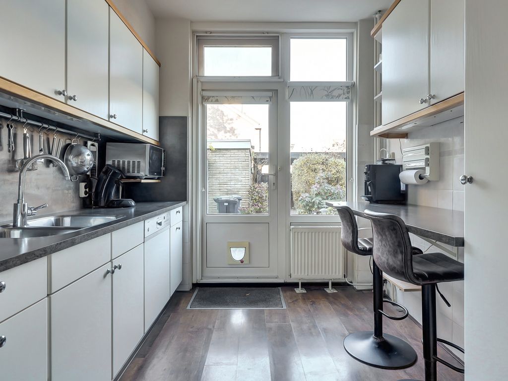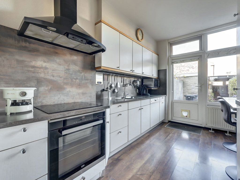 Aan de achterzijde van de woning ligt de afgesloten keuken (circa 9 m²). Deze is uitgevoerd in een lichte kleurstelling met een dubbele rvs-spoelbak, inductie kookplaat, heteluchtoven, afzuigkap, vaatwasser, koelkast en losse magnetron. Door de grote raampartij en tuindeur valt er veel daglicht naar binnen en is er direct contact met de achtertuin.
