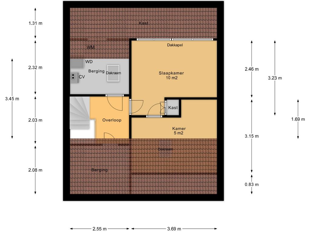 Zolder-/slaapkamer (5) ca. 3.15 x 3.69 m.